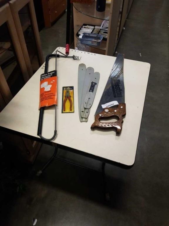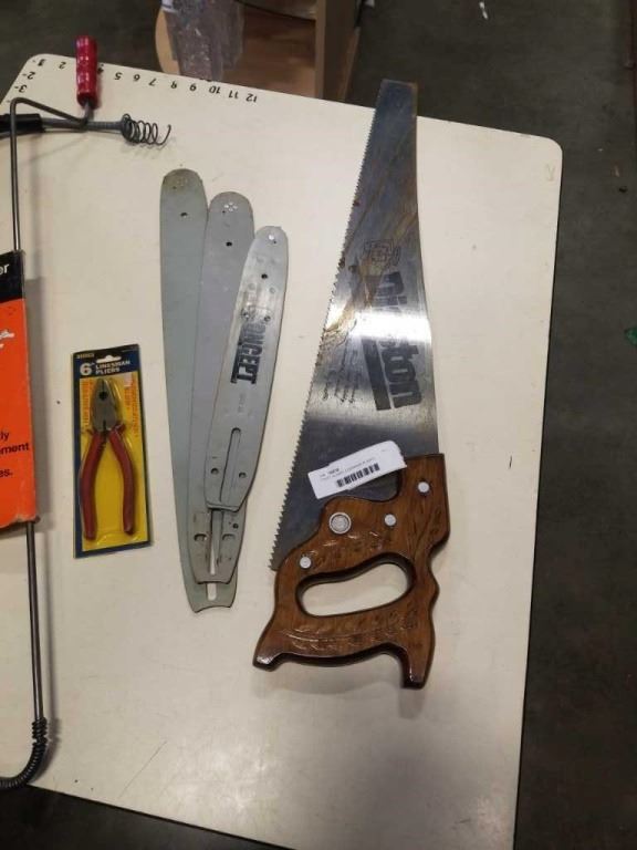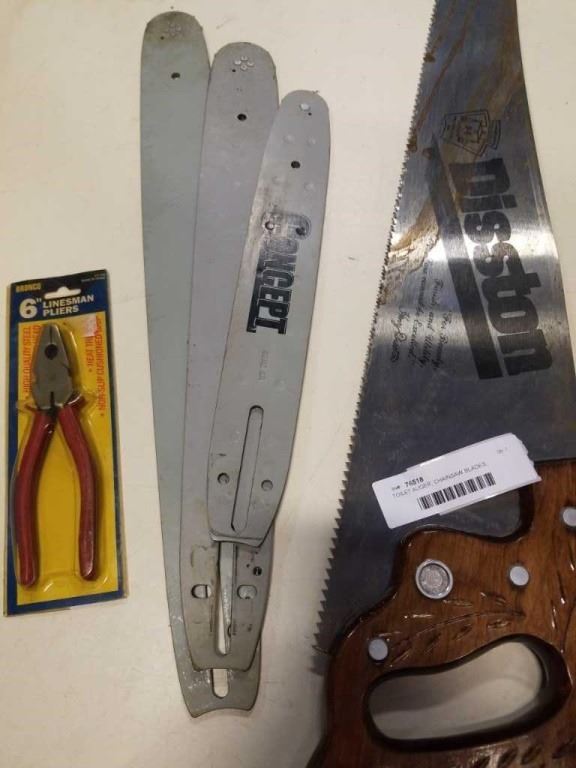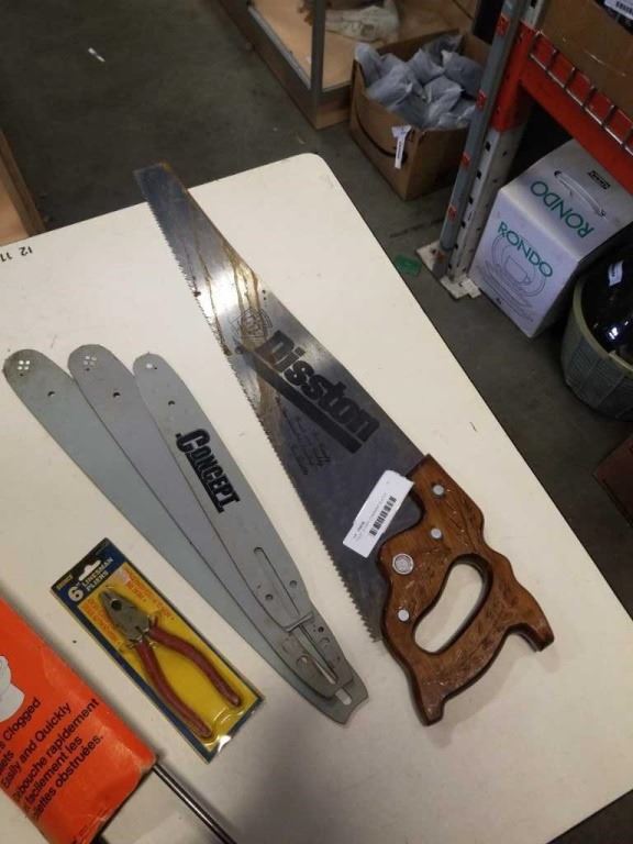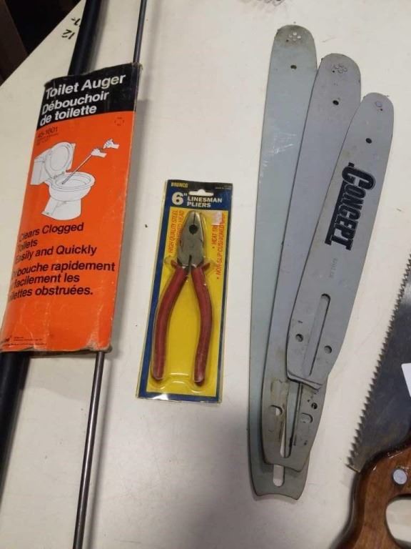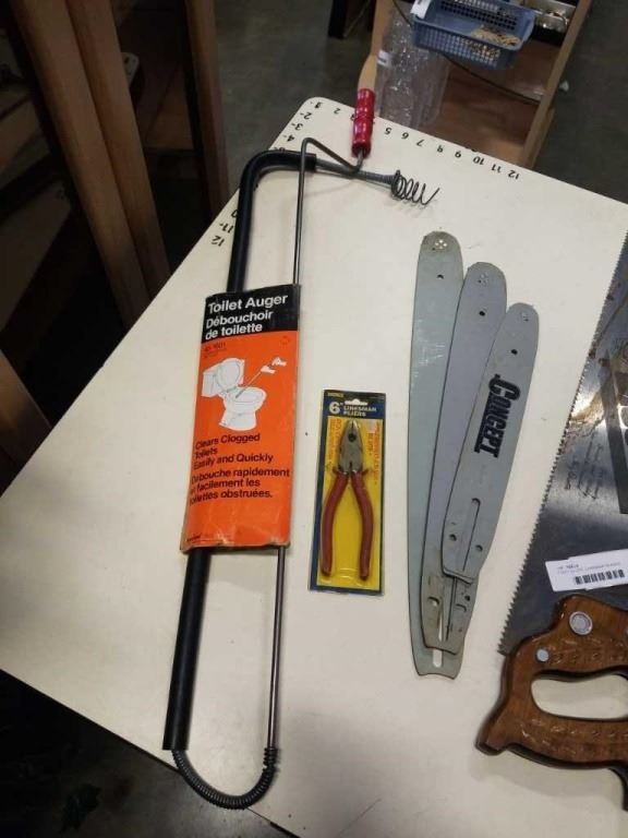 TOILET AUGER, CHAINSAW BLADES, HANDSAW AND PLIERS