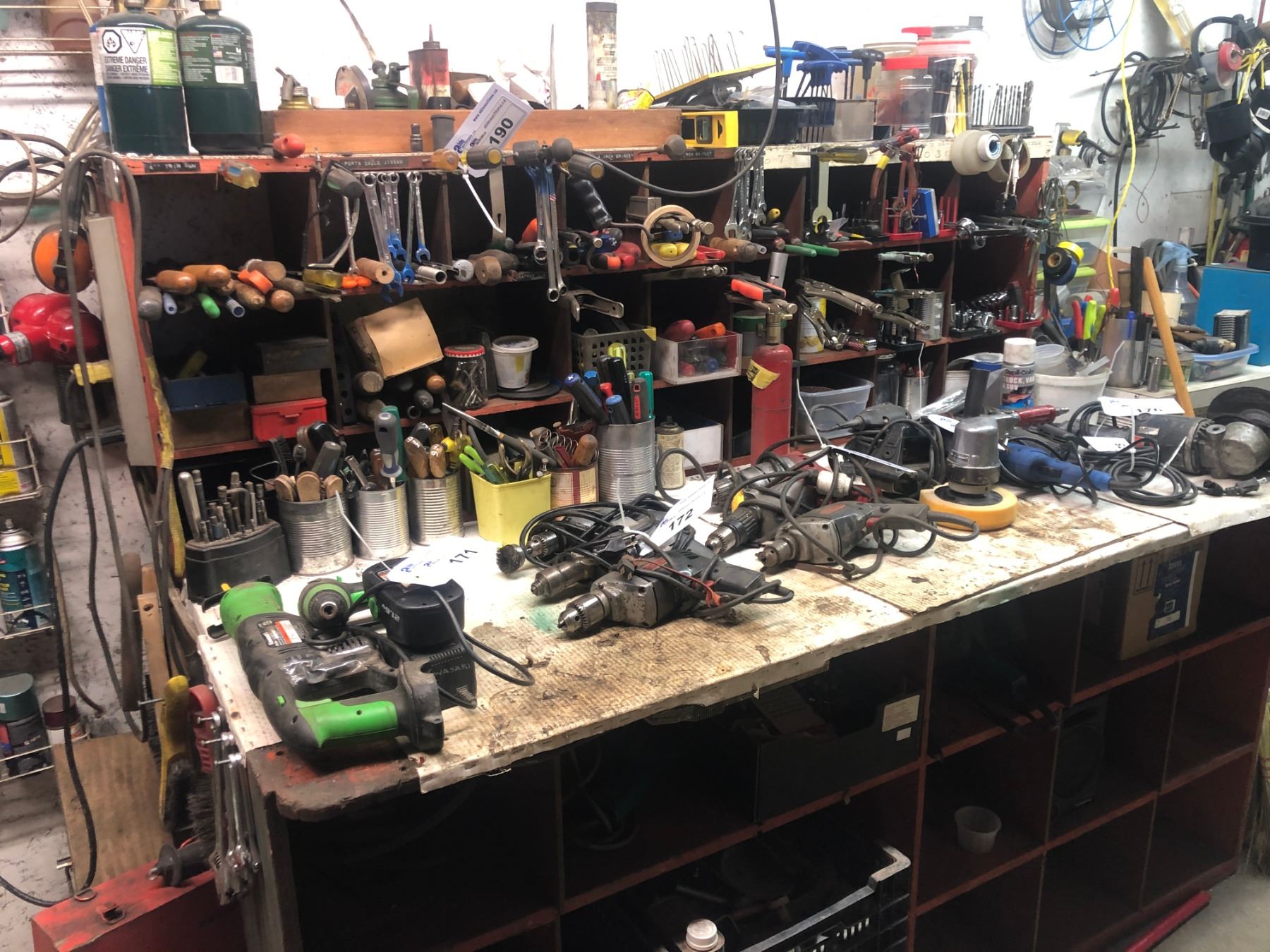 TOOL BENCH AND REMAINING CONTENTS INCLUDING HAND TOOLS AND MORE