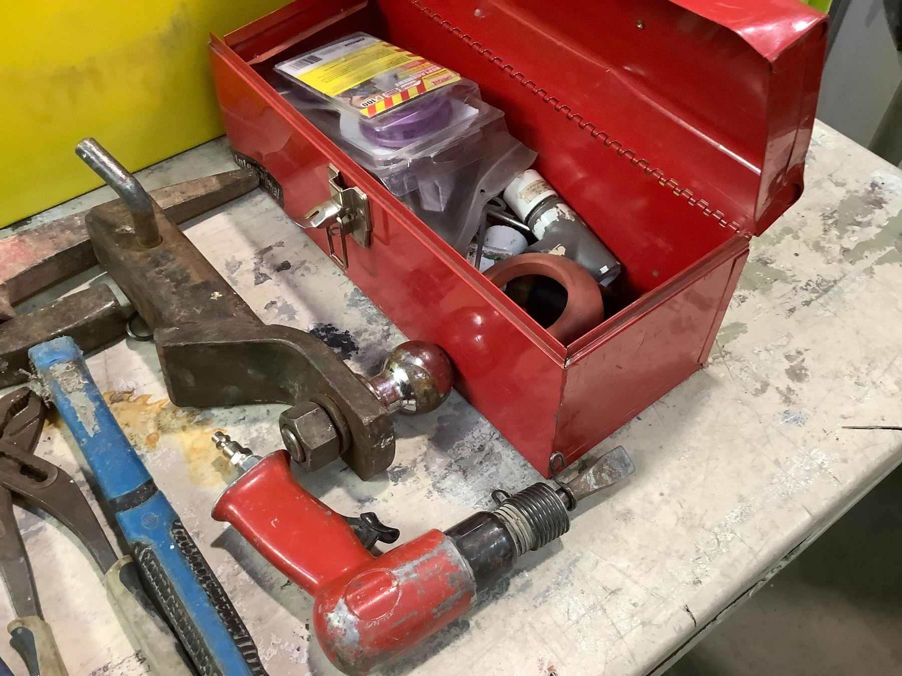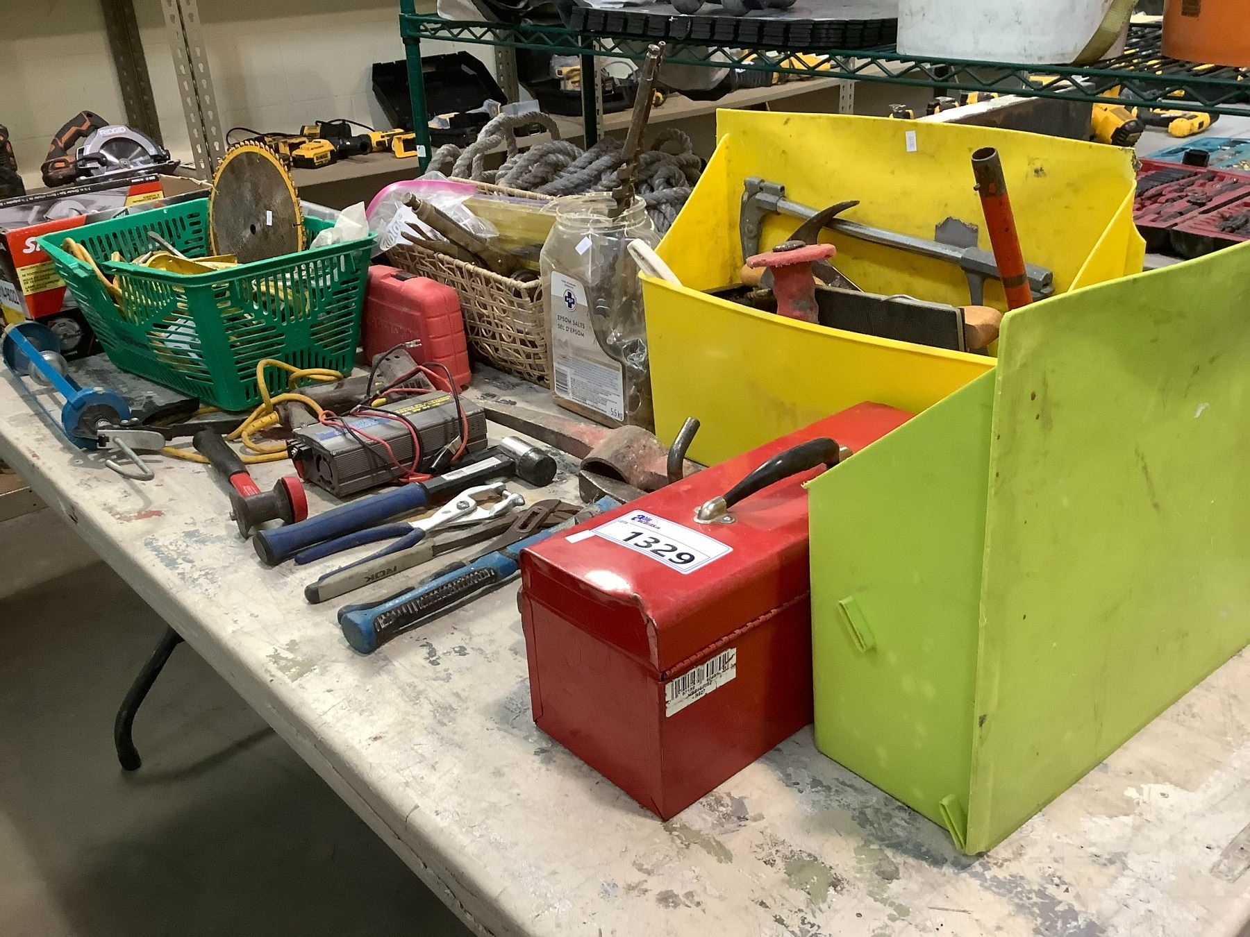 TOOL CONTENTS OF TABLE, TOOLBOX, CAR INVERTER, HAMMERS, PLIERS, AND MORE