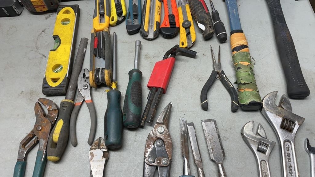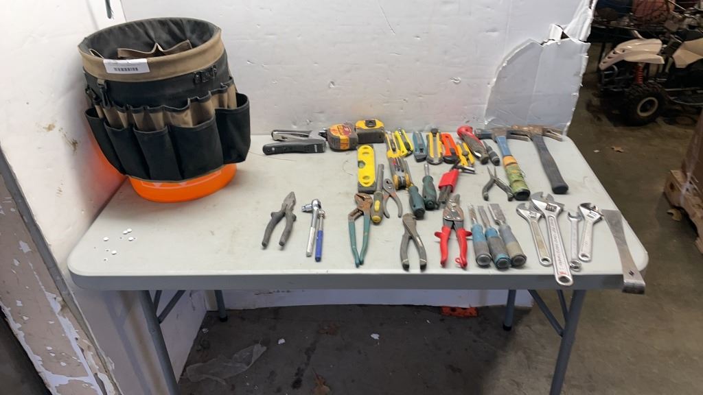 TOOL PAIL WITH TOOLS, WRENCHES, PRY BAR, HAMMERS
