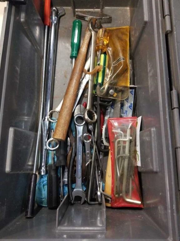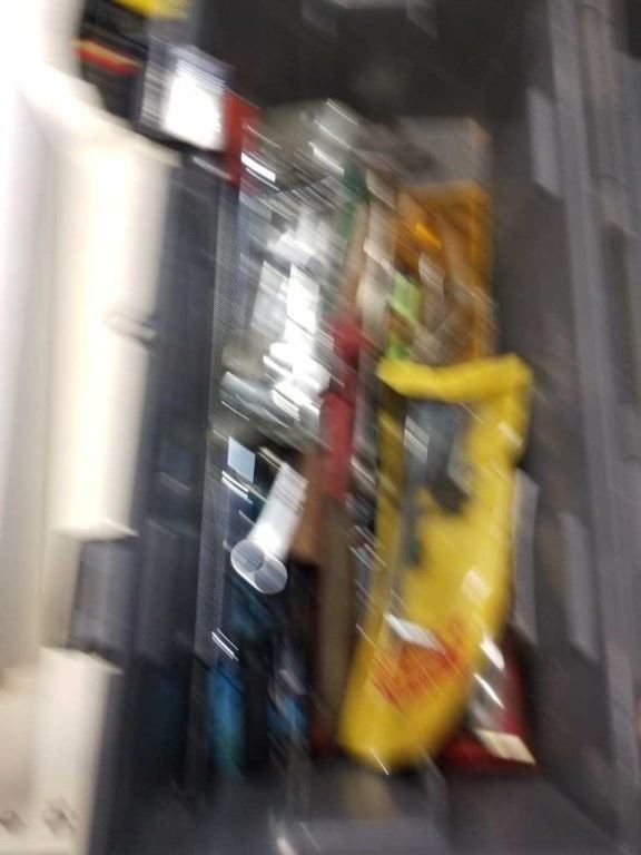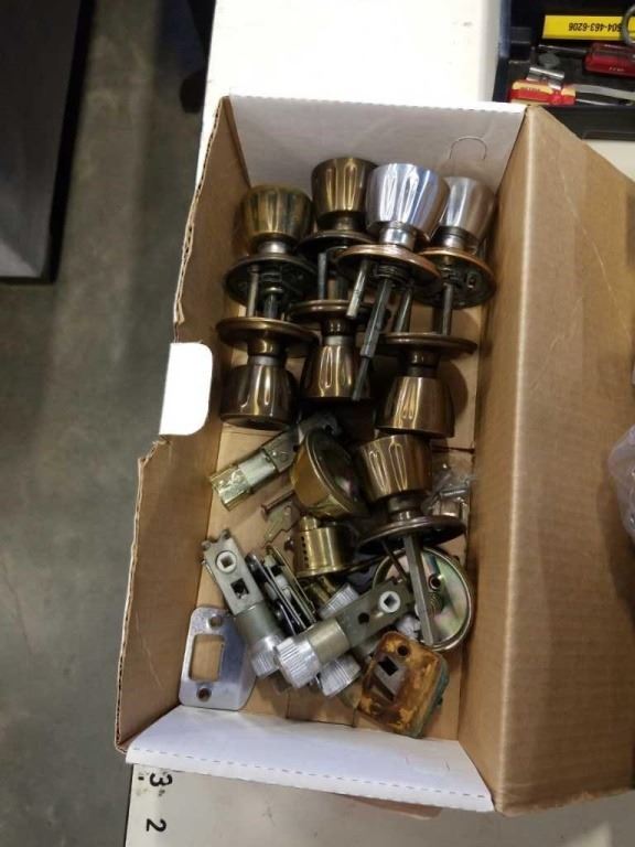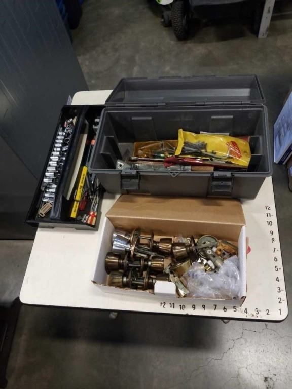 TOOLBOX WITH CONTENTS AND BOX OF DOORKNOBS