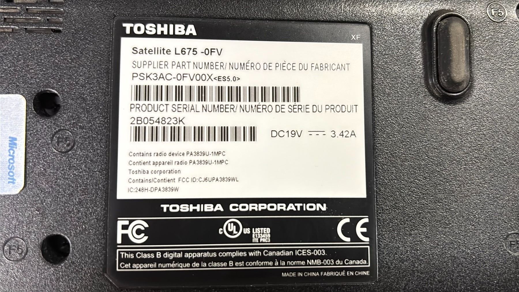 TOSHIBA LAPTOP *HARD DRIVE REMOVED/NO POWER CABLES*