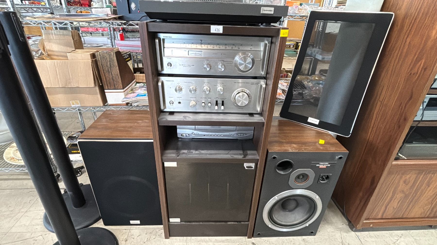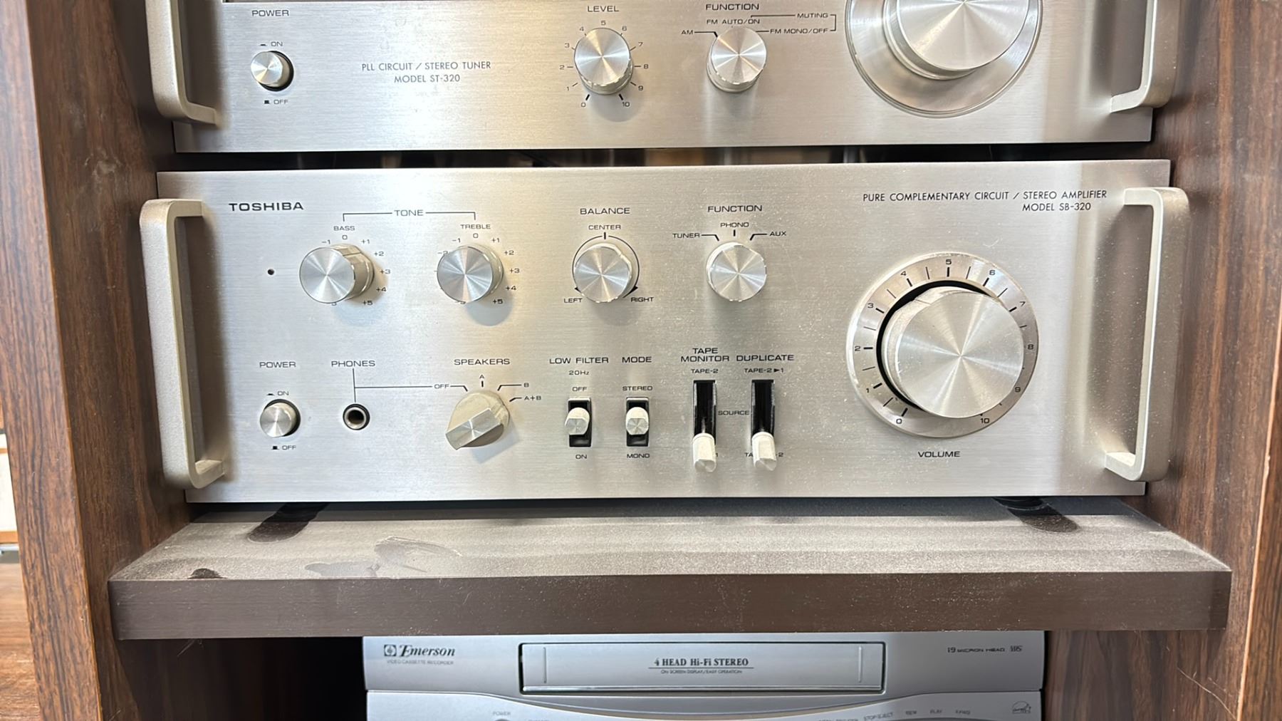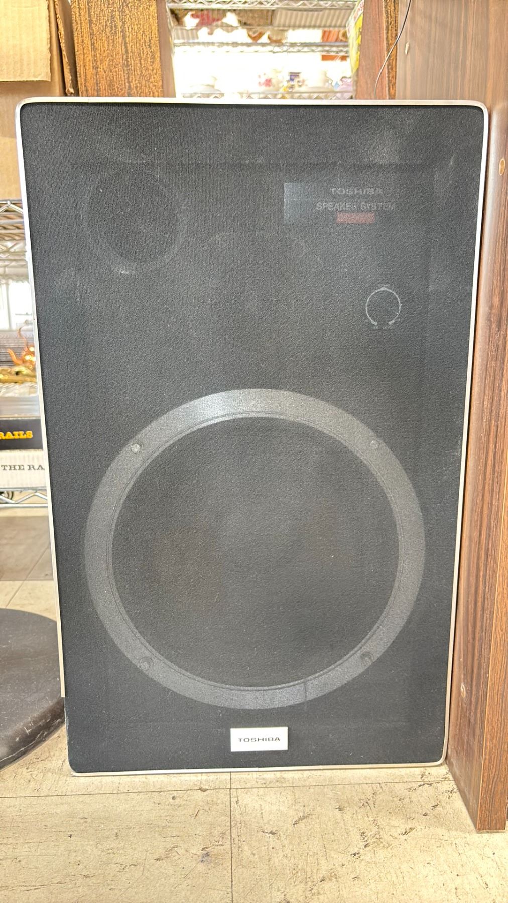 TOSHIBA STEREO, EMERSON VHS PLAYER, TOSHIBA RECORD PLAYER & TWO TOSHIBA SPEAKERS WITH STAND