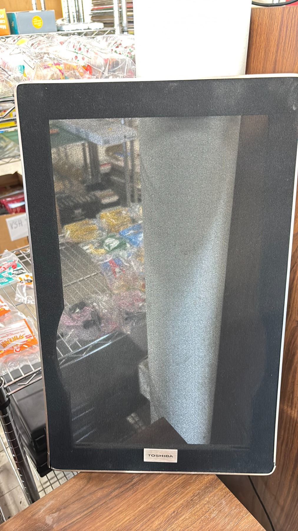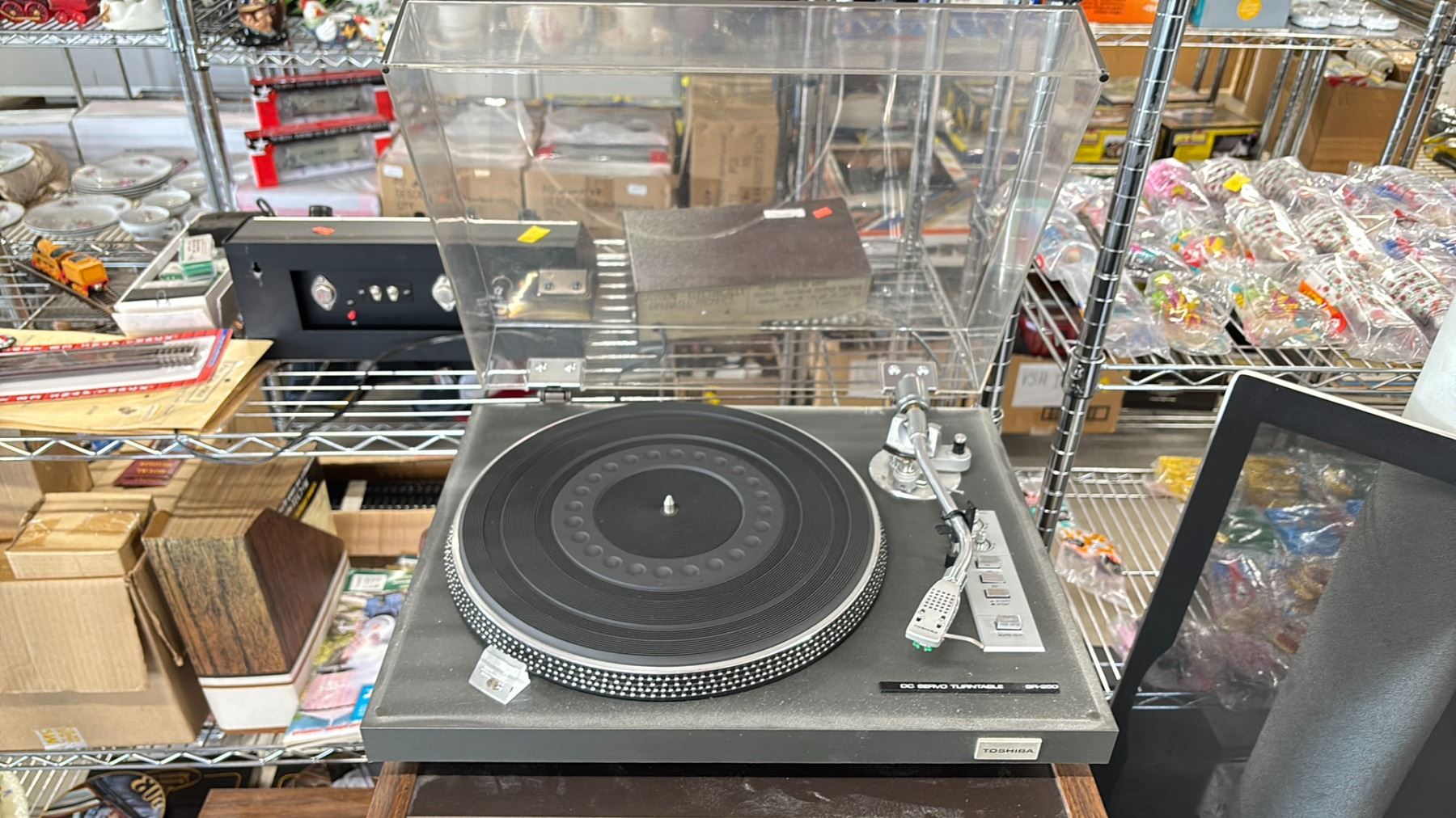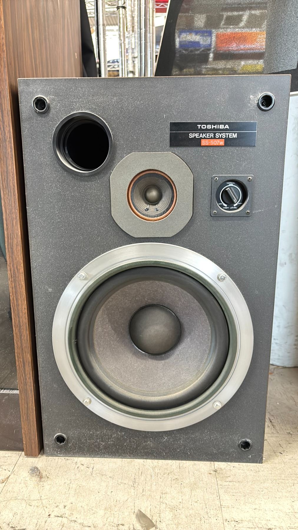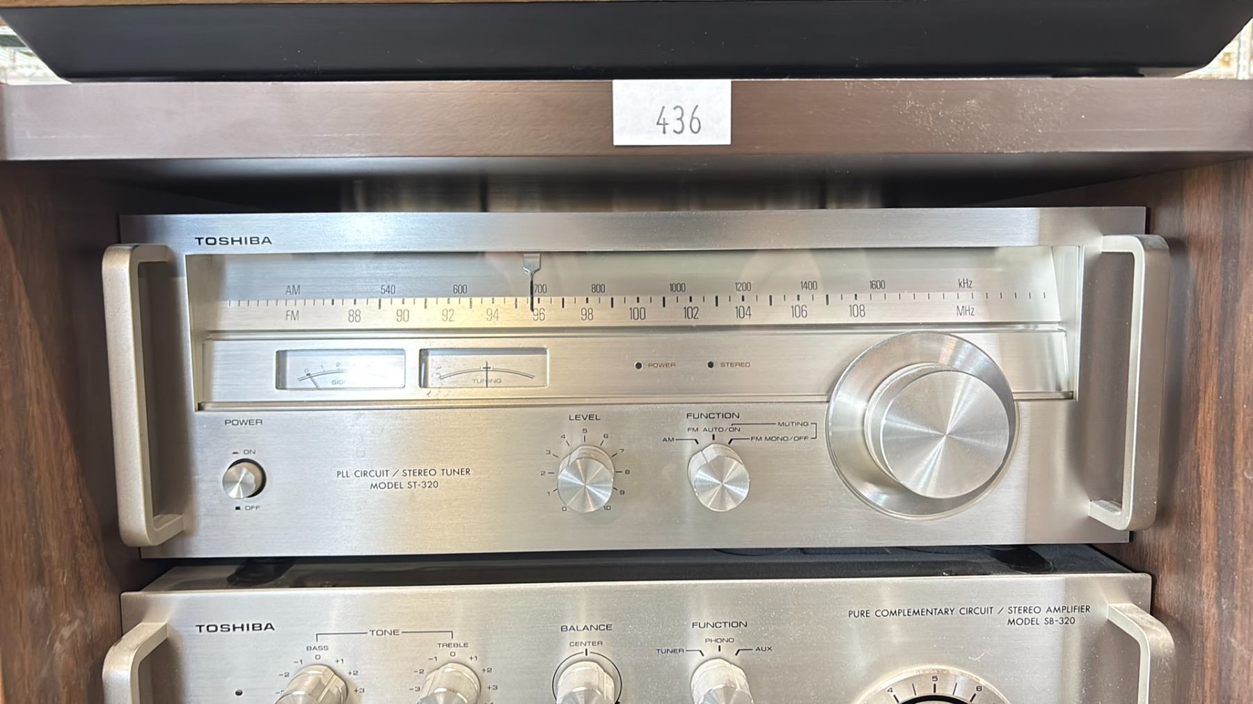 TOSHIBA STEREO, EMERSON VHS PLAYER, TOSHIBA RECORD PLAYER & TWO TOSHIBA SPEAKERS WITH STAND