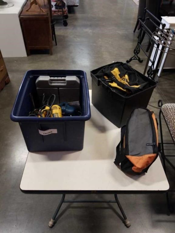 TOTE AND BIN OF TOOLS, JIGSAW, TOOL BAGS, SOCKET SET