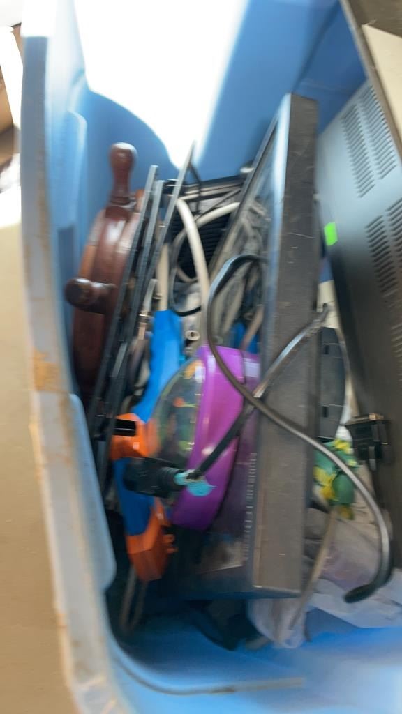 TOTE AND BOX OF GMAING WHEEL, CONTROLLERS, VR HEADSET AND MORE