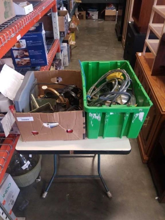 TOTE AND BOX OF TOOLS, HARDWARE FASTENERS AND ELECTRICAL