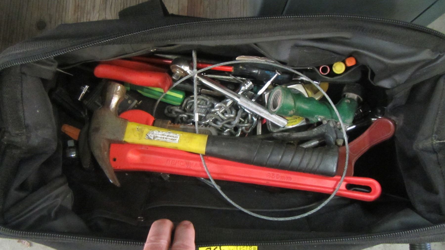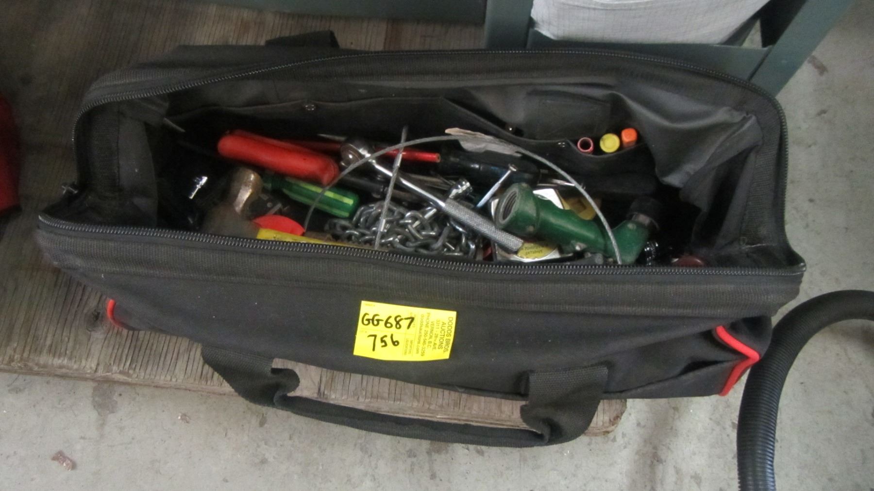 TOTE BAG W/MISC. TOOLS, PIPE WRENCH, HAMMERS, ETC.