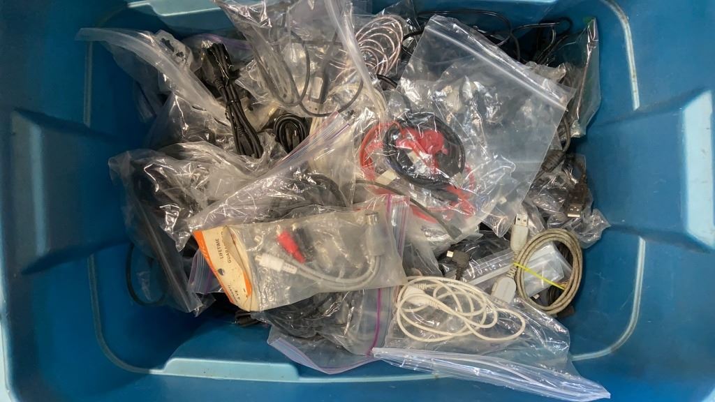 TOTE FULL OF ASSORTED CHARGING CABLES AND CORDS