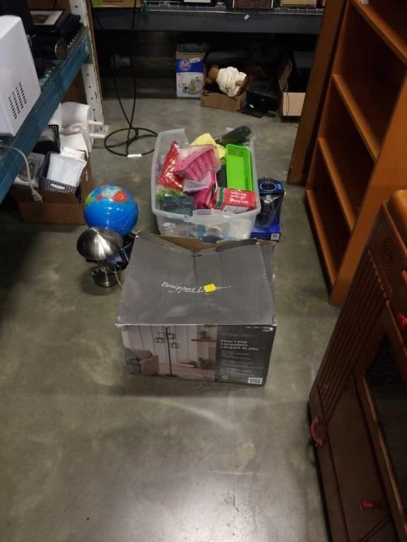 TOTE OF AMAZON OVERSTOCK ITEMS, FLOOR LAMP, TABLE LAMP AND GLOBE