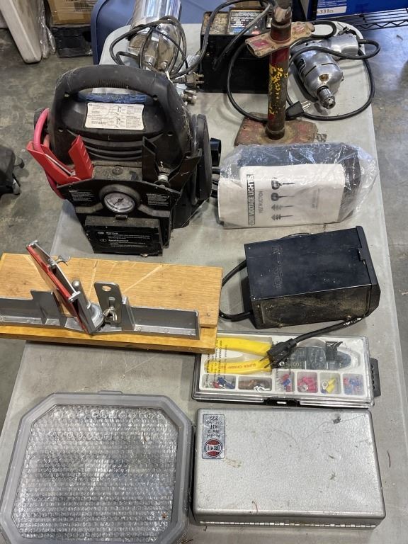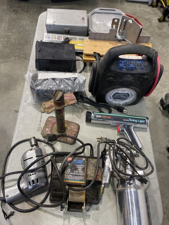TOTE OF ASSORTED SHOP TOOLS, BIT SETS AND MORE