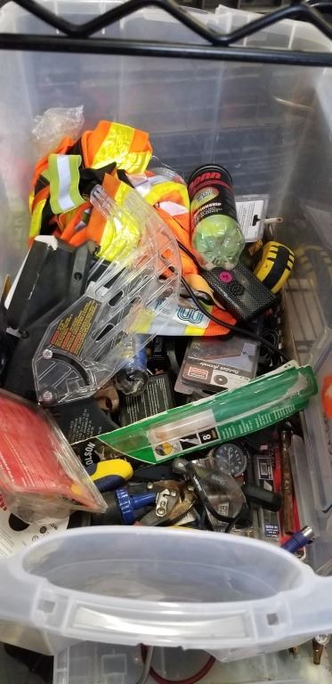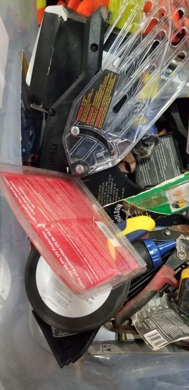 TOTE OF ASSORTED SHOP TOOLS, HAND TOOLS, ACCESSORIES AND SUPPLIES