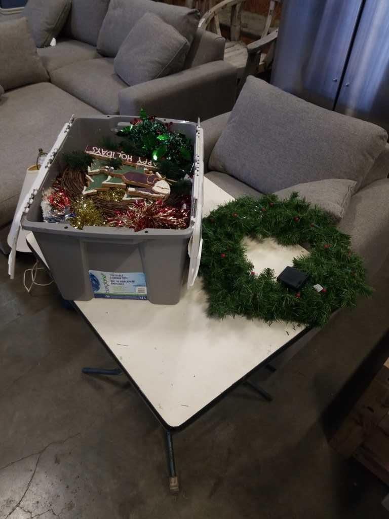 TOTE OF CHRISTMAS DECOR AND LIGHT UP WREATH