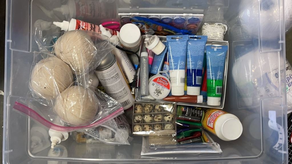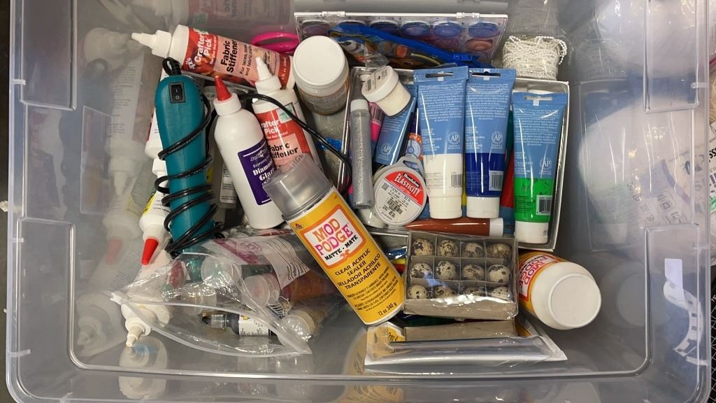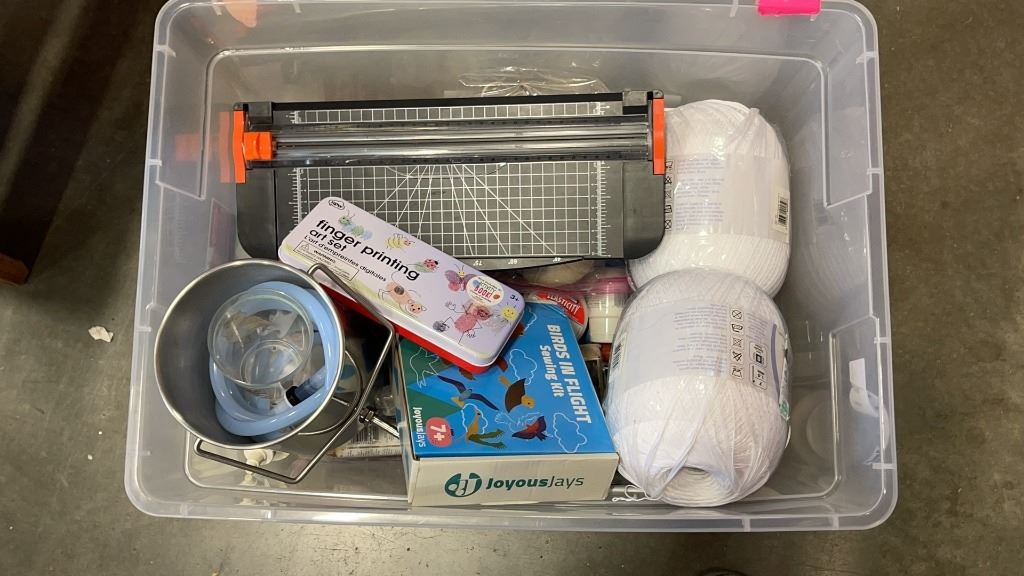 TOTE OF CRAFT SUPPLIES, THREAD, HEAT GUN, CUTTER ETC