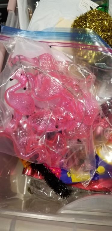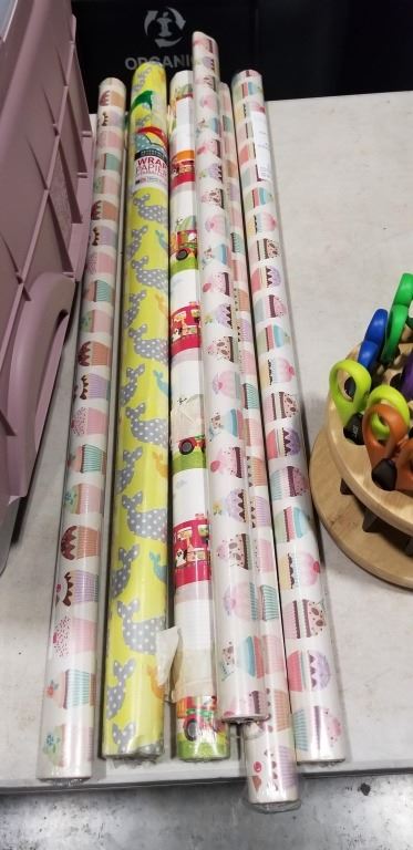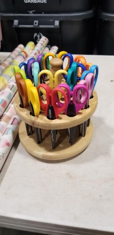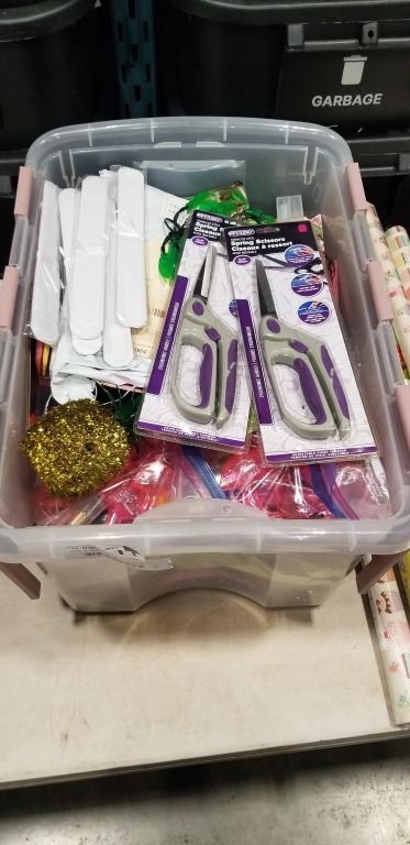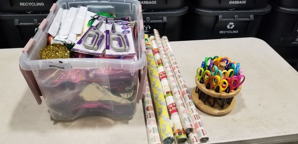 TOTE OF CRAFTING SUPPLIES, SCISSORS, AND WRAPING PAPPER
