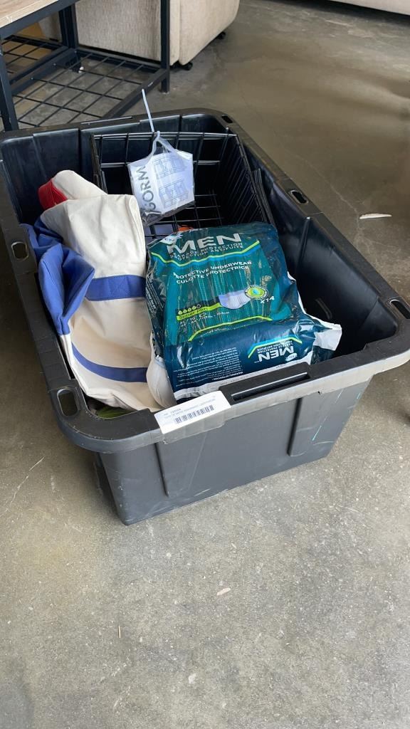 TOTE OF MENS ABSORBANT UNDERWEAR, IKEA SHELF, REUSABLE BAGS AND MORE