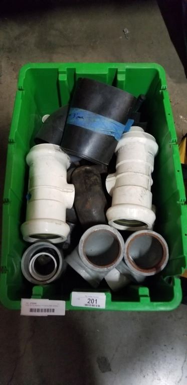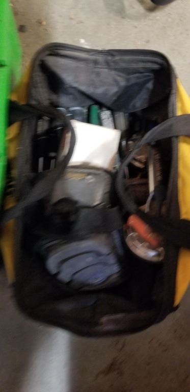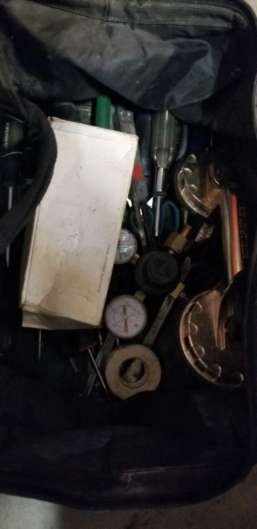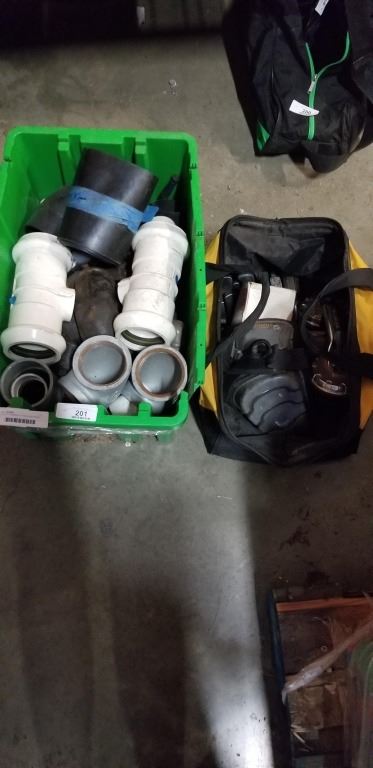 TOTE OF PLUMBING FITTINGS AND DEWALT TOOL BAG WITH HAND TOOLS, KNEEPADS ETC