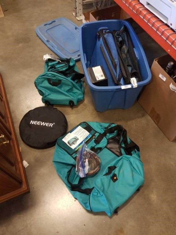 TOTE OF ROLLING DUFFEL BAGS, TOOLED LEATHER BELTS, WINDHSIELD REFLECTOR