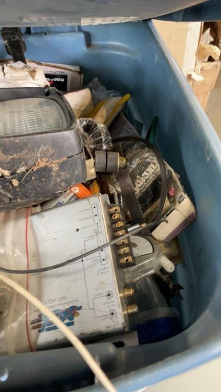TOTE OF SHOP SUPPLIES, BENCH GRINDER, TORUBLE LIGHT, CORDLESS DRILL