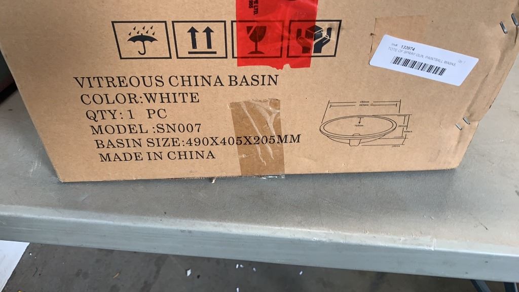 TOTE OF SPRAY GUN, PAINTBALL MASKS, BATHROOM SINK AND MORE