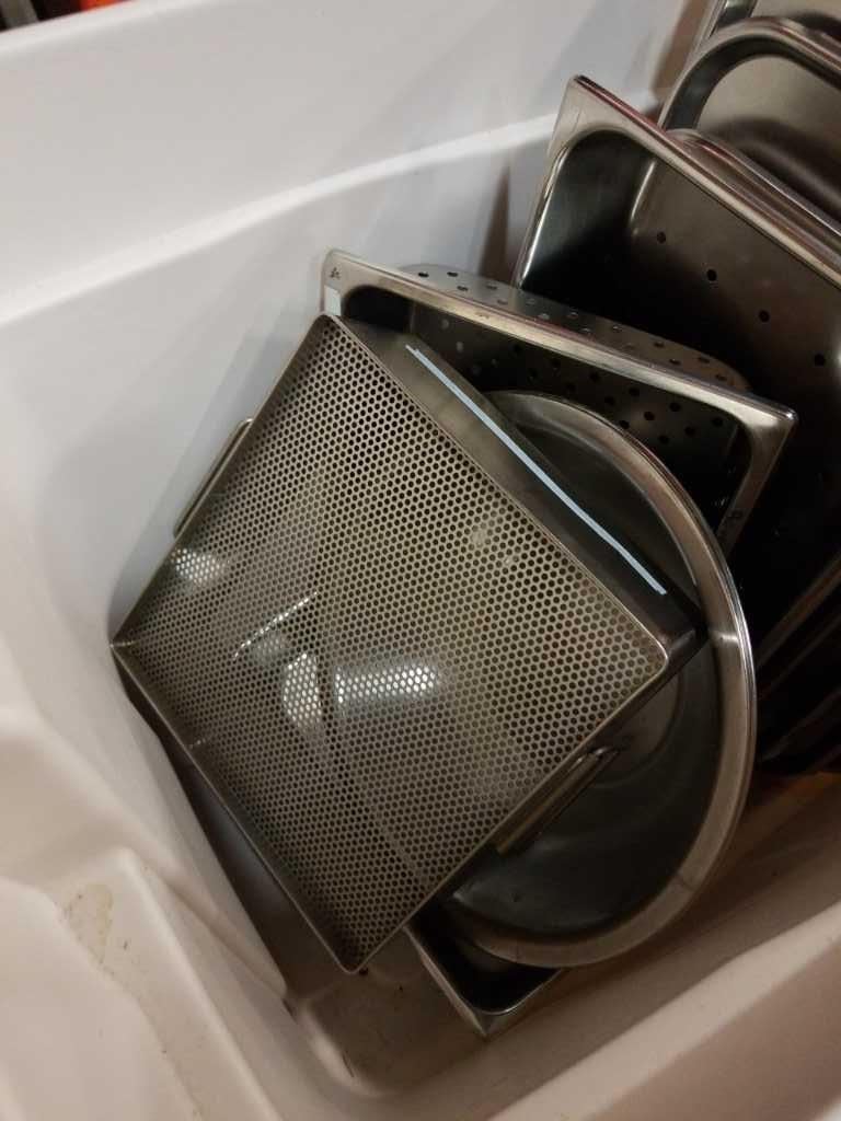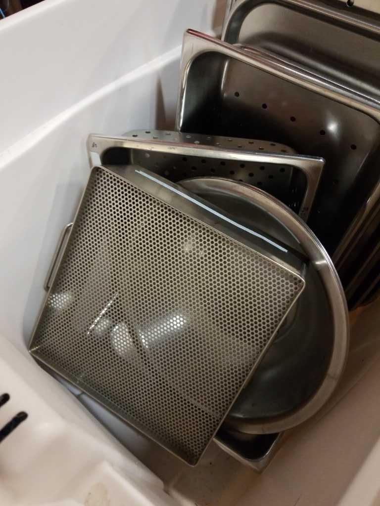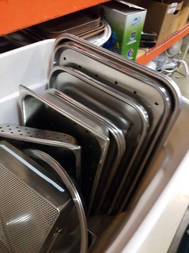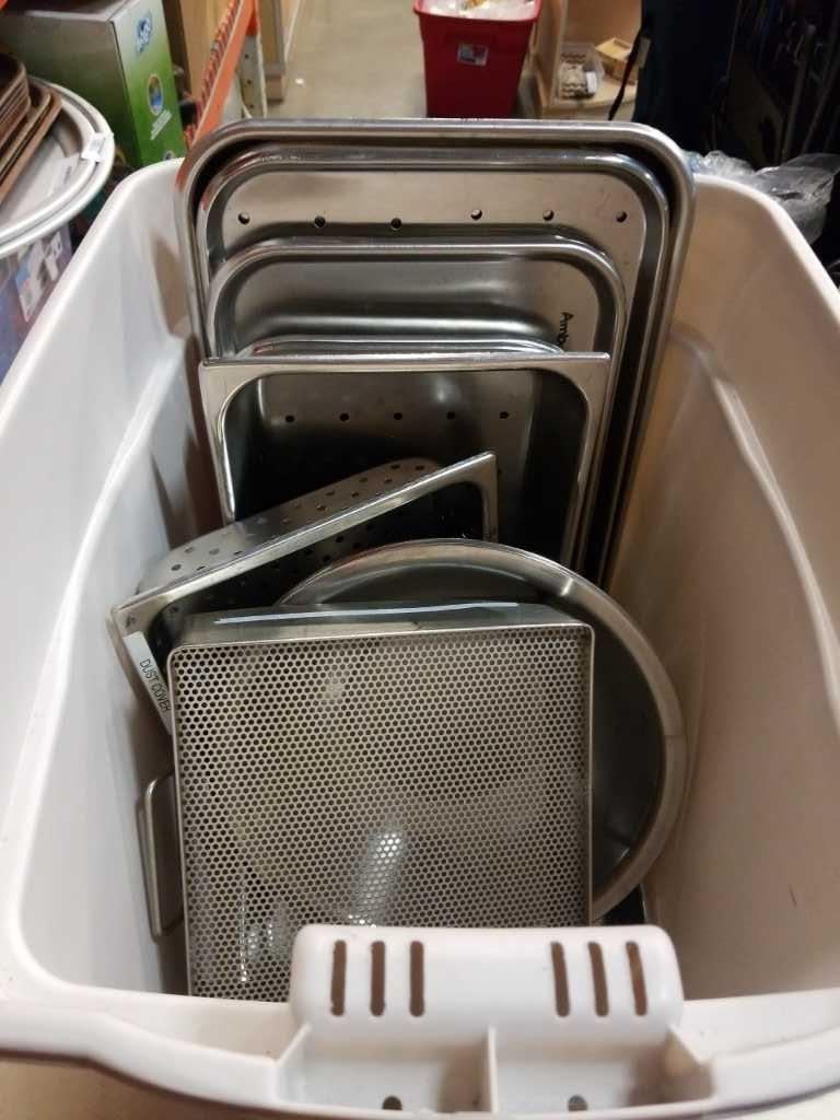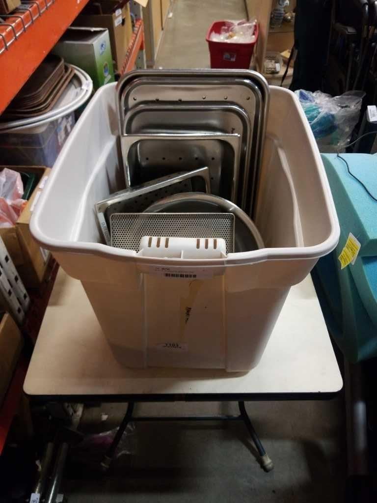 TOTE OF STAINLESS SERVING AND STEAMING DISHES