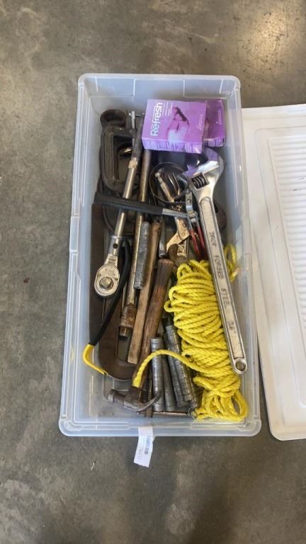 TOTE OF TOOLS, 24 INCH ADJUSTABLE WRENCH, 20 INCH RATCHET WRENCH, CLAMPS, ROPE
