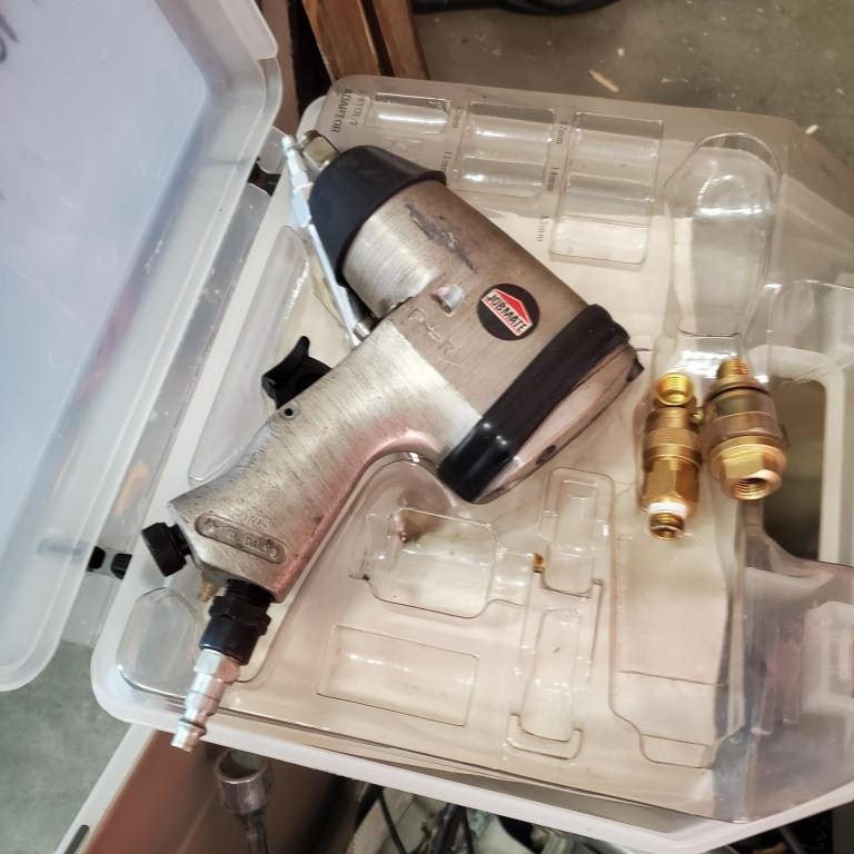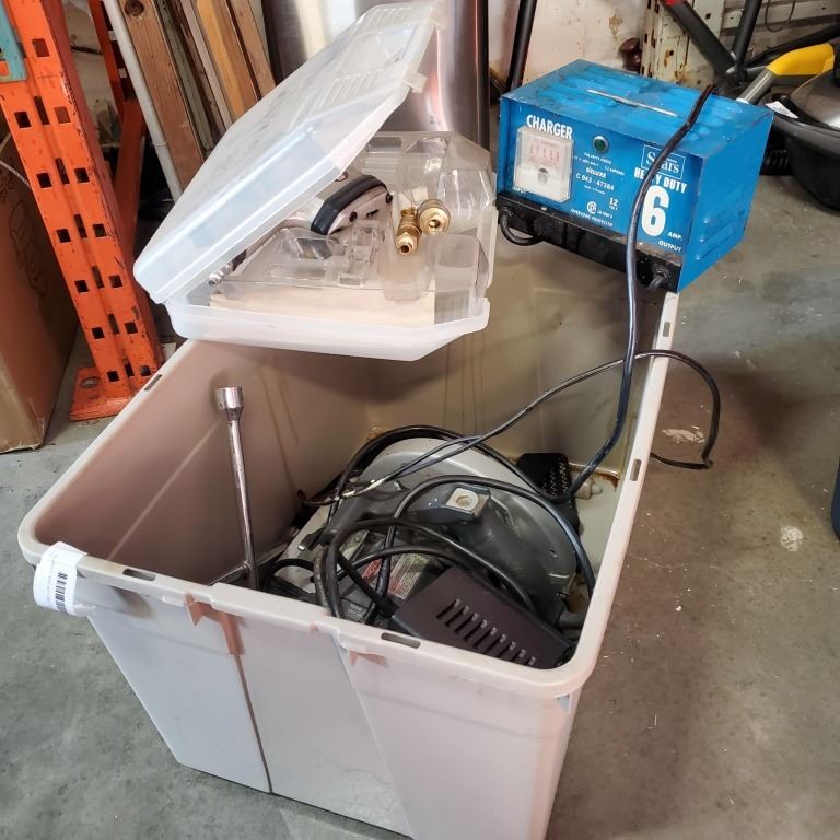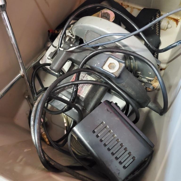 TOTE OF TOOLS, CIRCULAR SAW JOBMATE AIR POWERED IMPACT WRENCH, BATTERY CHARGER