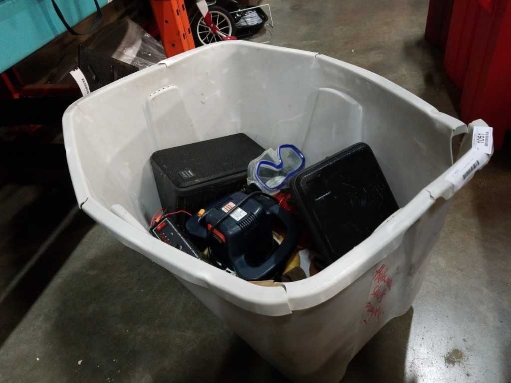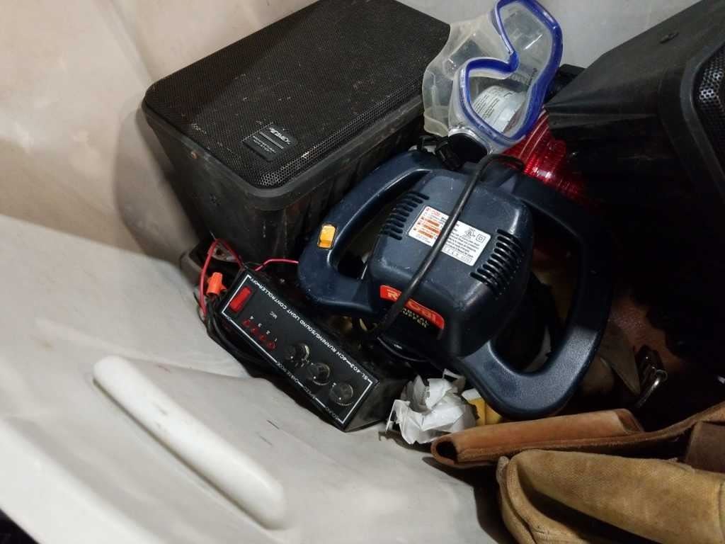 TOTE OF TOOLS, SPEAKERS, LIGHT CONTROLLERS AND MORE