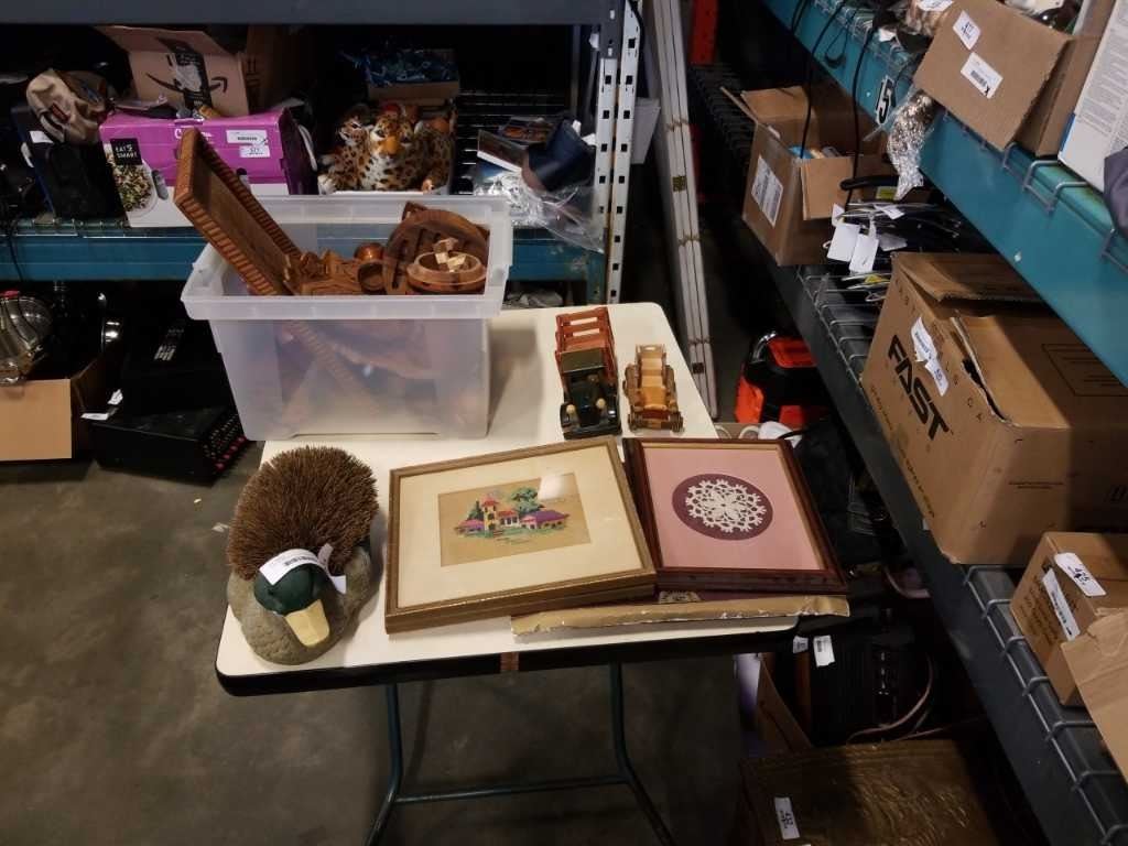 TOTE OF WOOD COLLECTIBLES, 3 PICTURES AND BOOT BRUSH DUCK