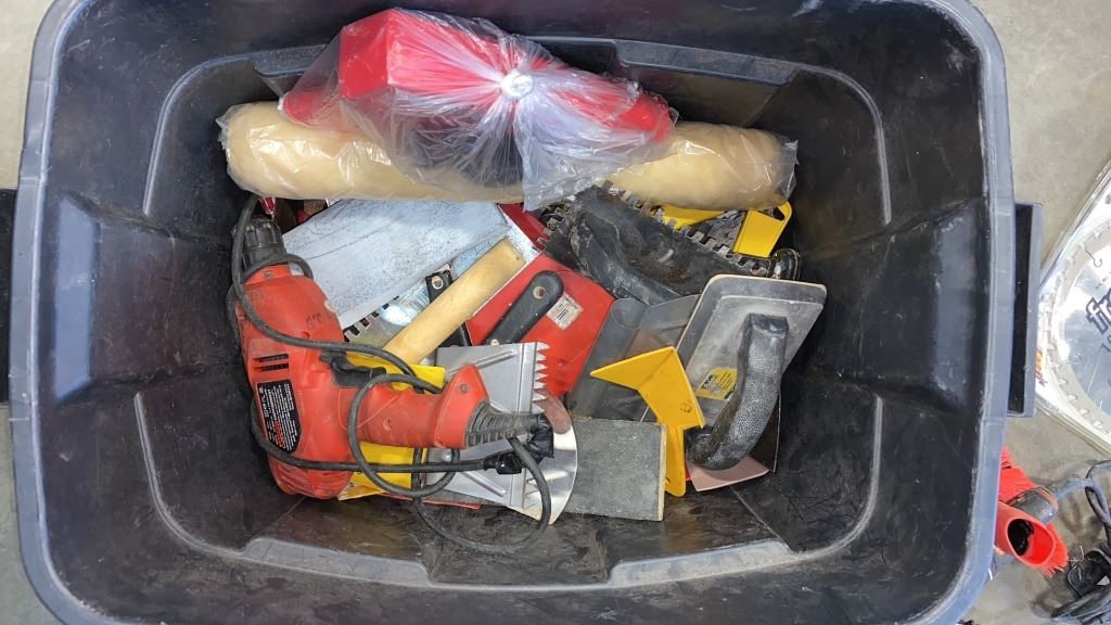 TOTE WITH SANDER, SOLDERING GUN, NEW 10" FREUD FINISHING BLADE, DRYWALL AND PAINTING TOOLS ETC