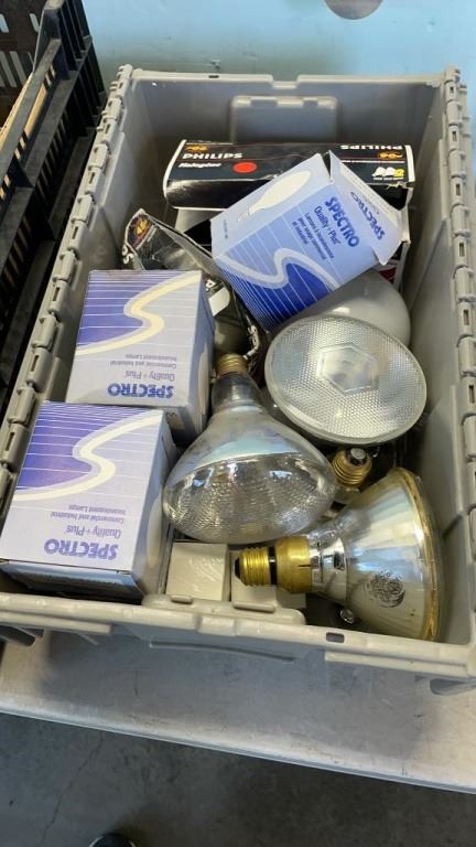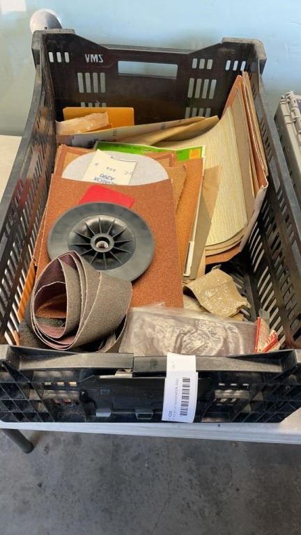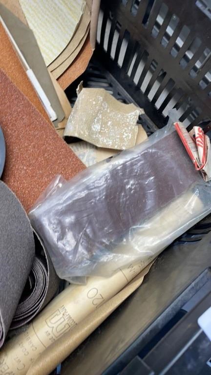 TRAY AND BIN OF SANDPAPER AND LIGHTBULBS