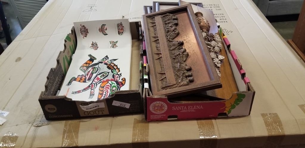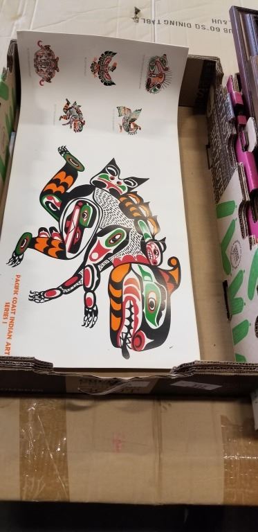 TRAY OF ASSORTED ARTWORK AND COPPER HANFING, AND NEW PACIFIC COAST INDIAN ART POSTERS