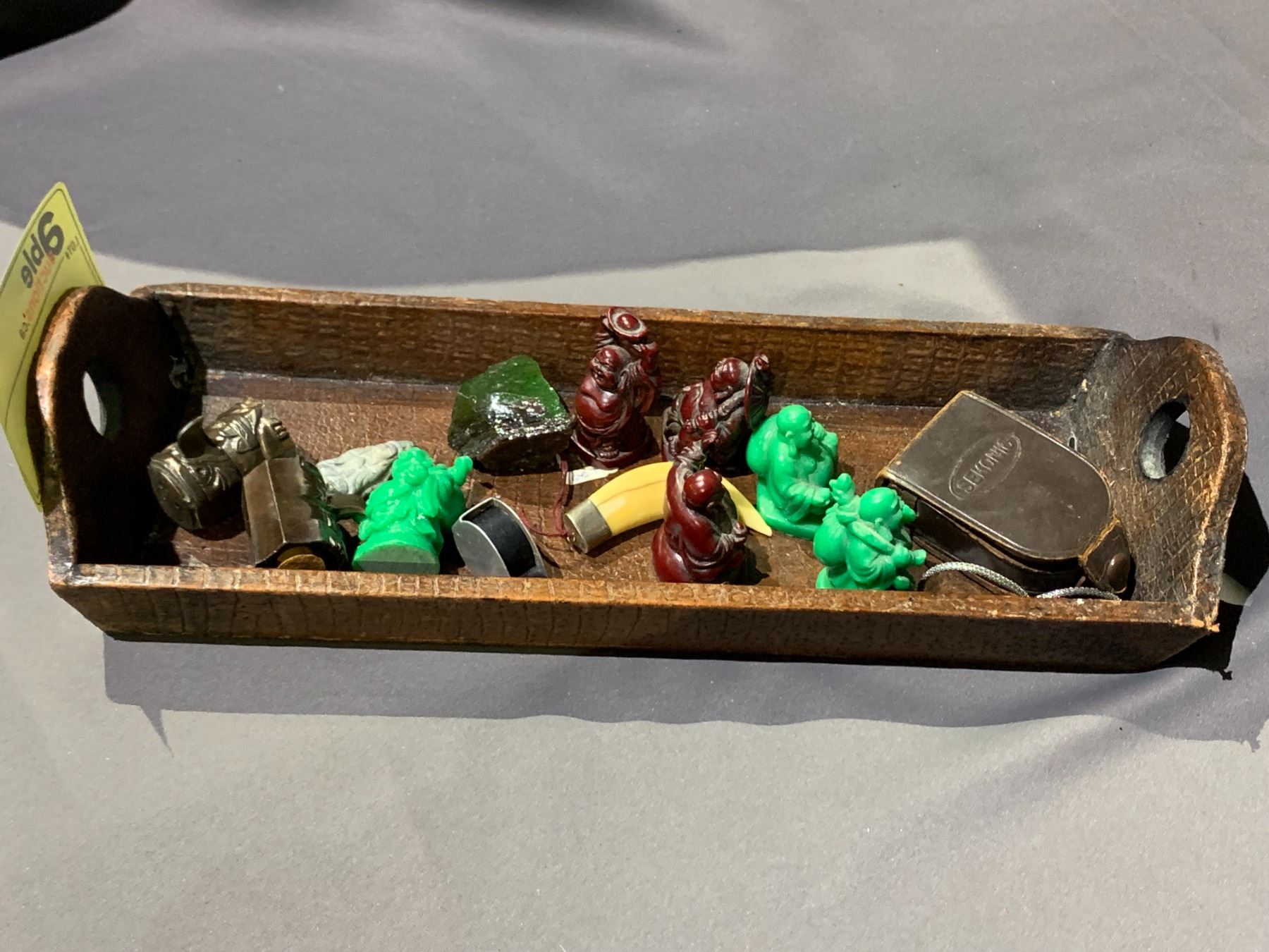 TRAY OF ASSORTED COLLECTABLES, BUDDHA FIGURES, SALT AND PEPPER SHAKERS, AND MORE
