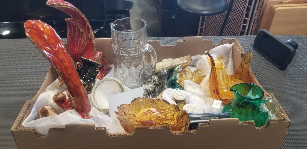 TRAY OF ASSORTED SALT AND PEPPER SHAKERS, ASSORTED ART GLASS, MCM ORNAMENTS AND TWO ANTIQUE CUP AND