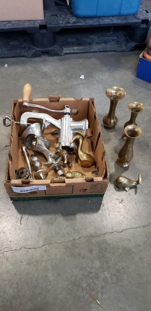 TRAY OF BRASS DECOR, FIGURES, MEAT GRINDER