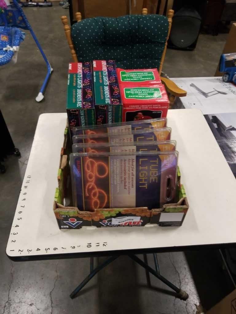 TRAY OF CHRISTMAS LIGHTS AND CERAMIC SANTAS