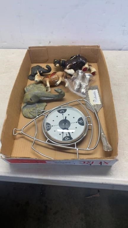 TRAY OF COLLECTIBLES: HORSE FIGURES, SALT/PEPPER SHAKER AND MORE