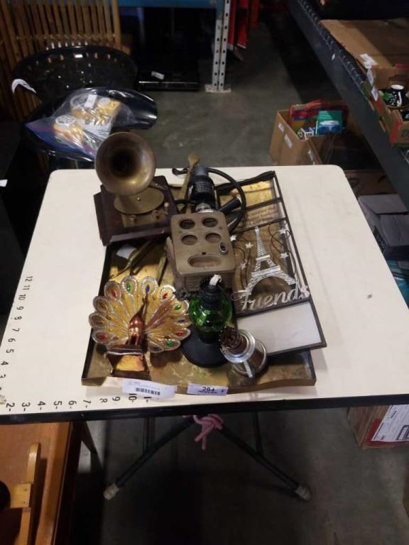 TRAY OF COLLECTIBLES: PEACOCK, KEGERATOR SPOUT, SCALE MUSIC BOX AND MORE