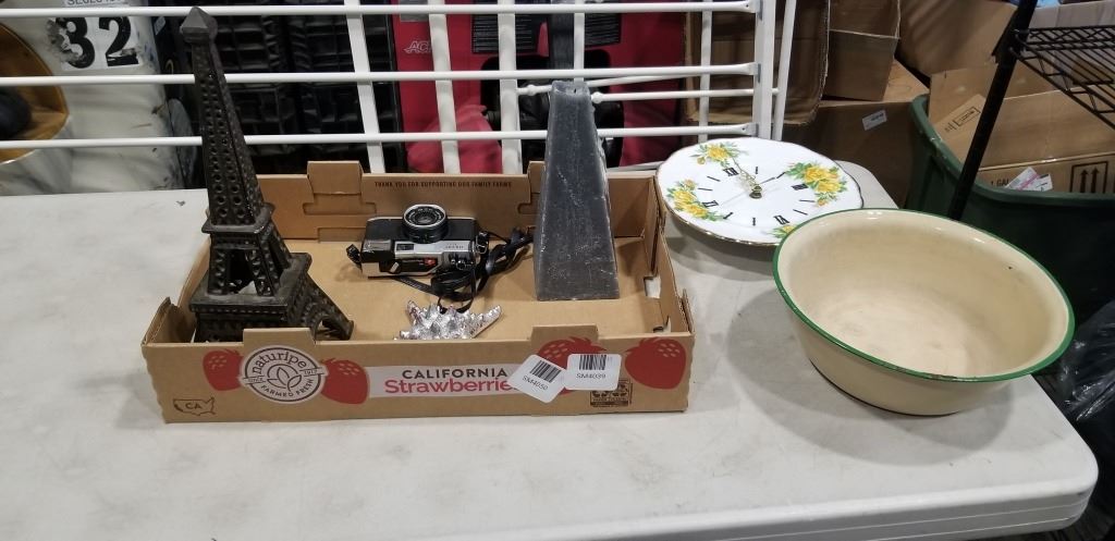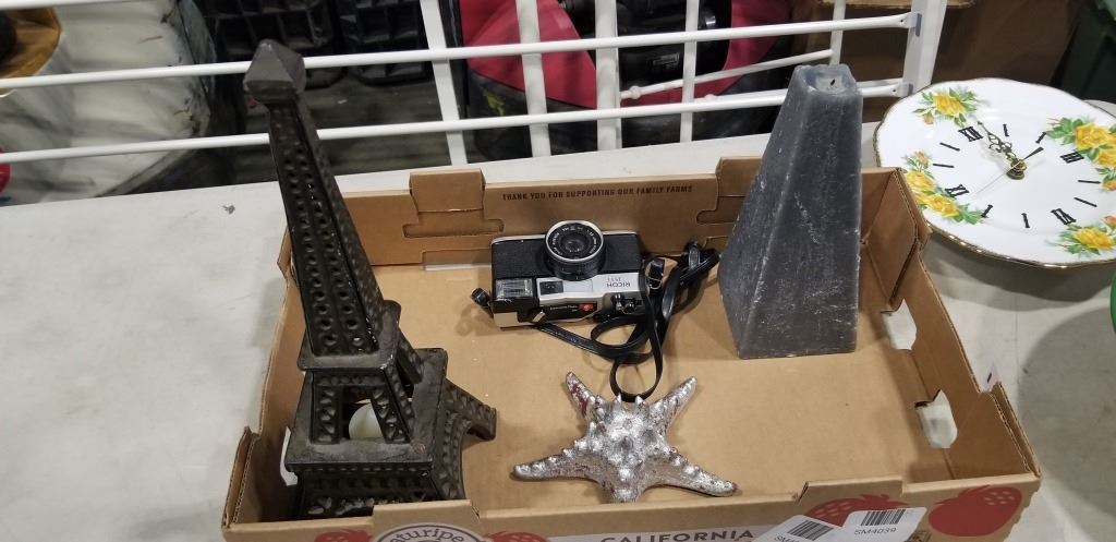 TRAY OF COLLECTIBLES - WALL CLOCK, CANDLES, VINTAGE CAMERA, ETC