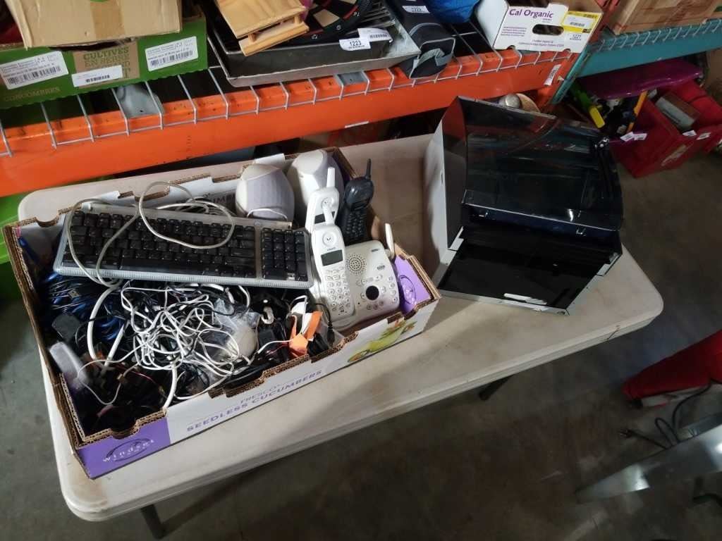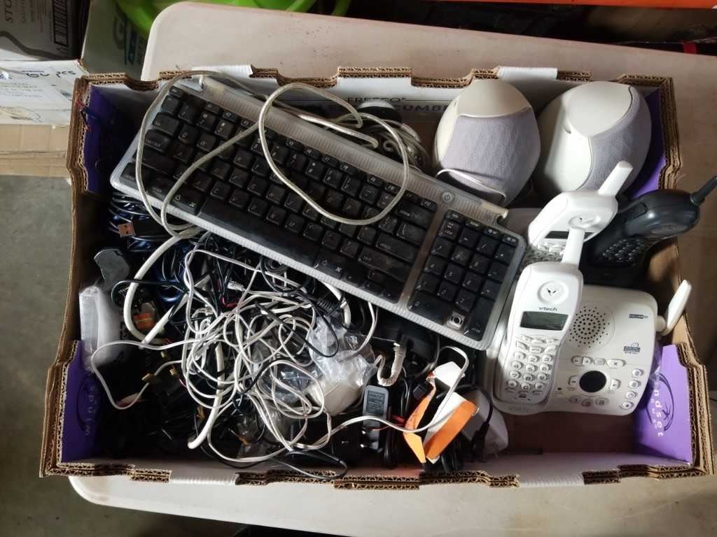 TRAY OF ELECTRONICS AND PAPER TOWEL DISPENSER