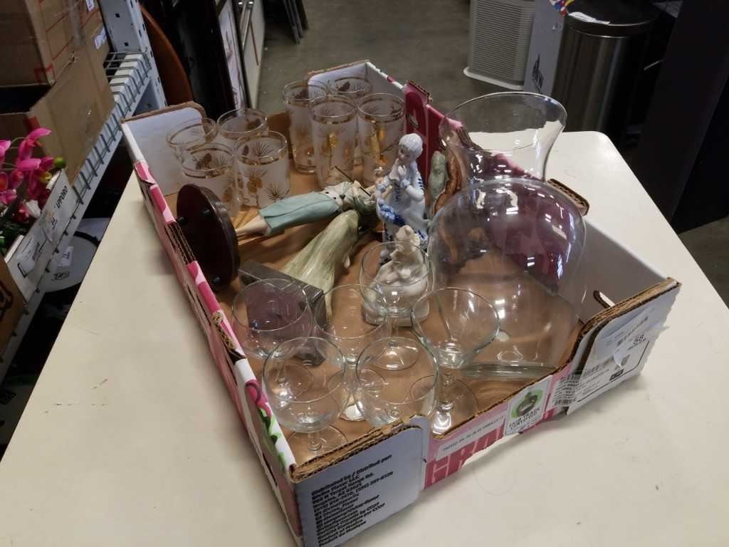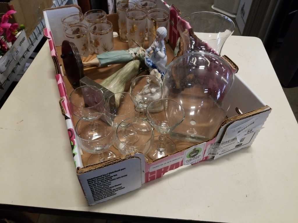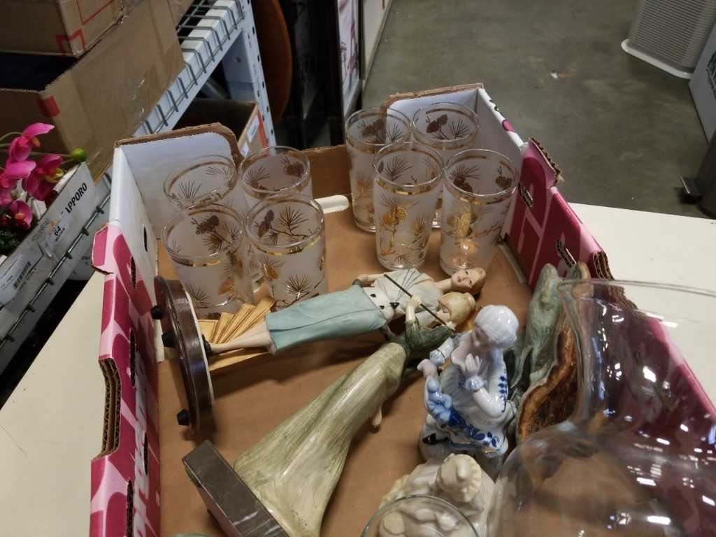 TRAY OF FIGURES, MCM GLASSES, VASE