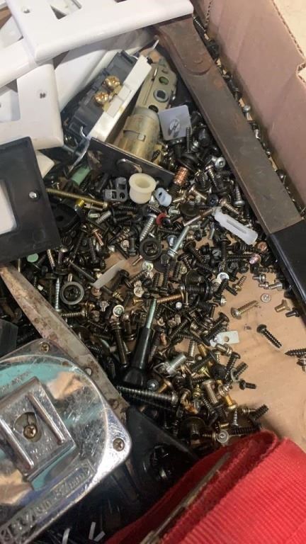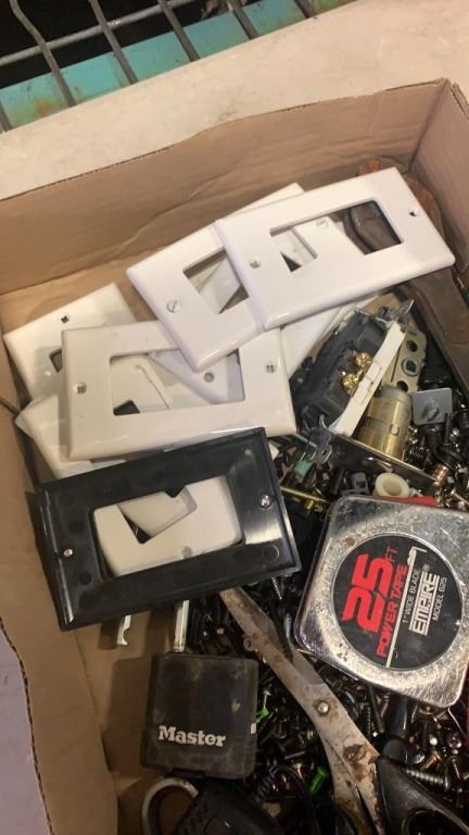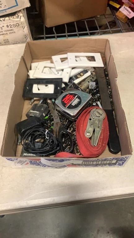 TRAY OF HARDWARE, TAPE MEASURE AND LOAD STRAP