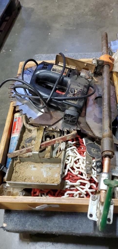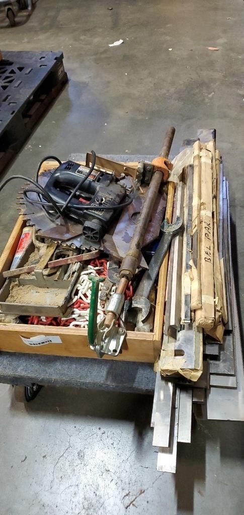 TRAY OF HEAVY DUTY SAW BLADES, STAINLESS BARS ETC