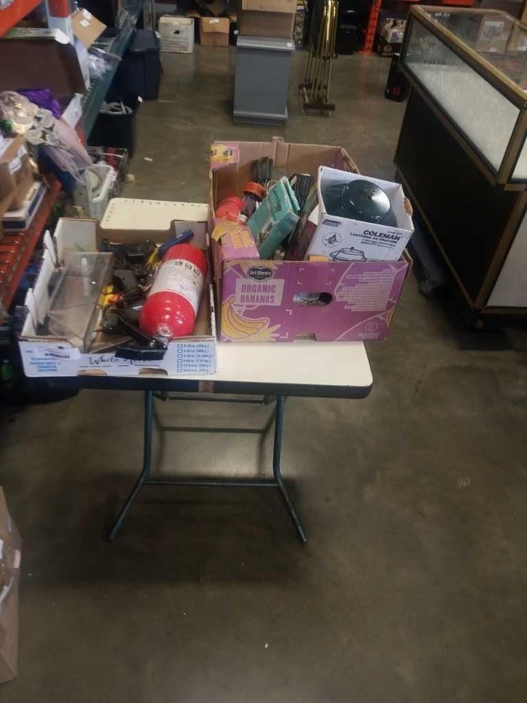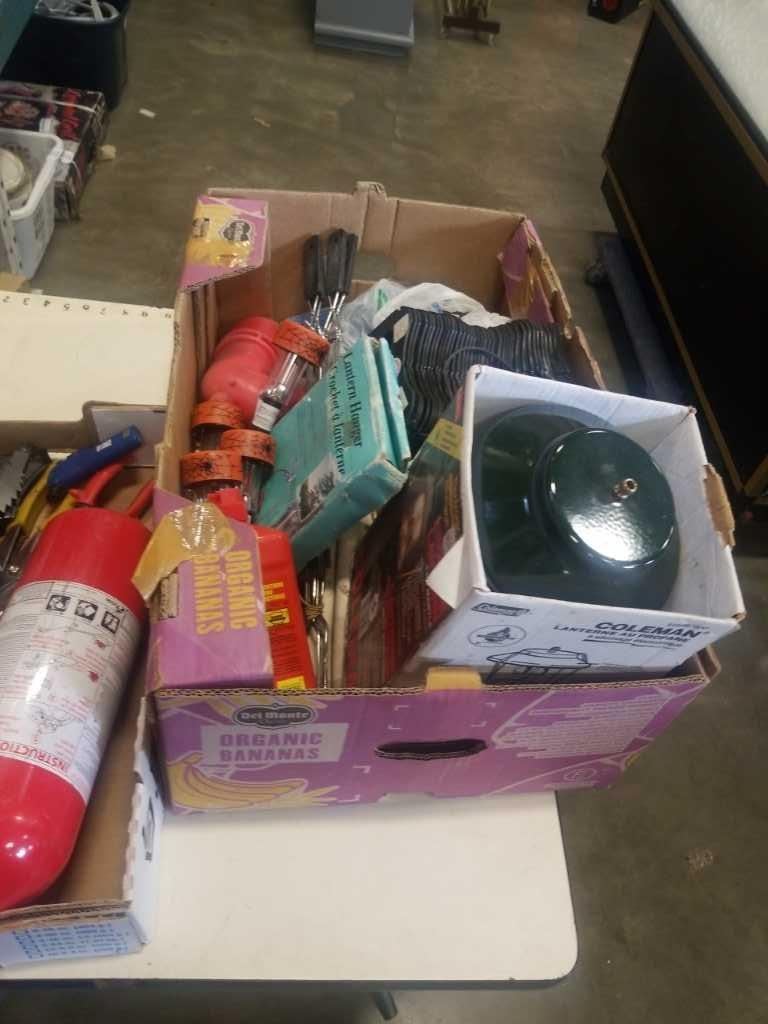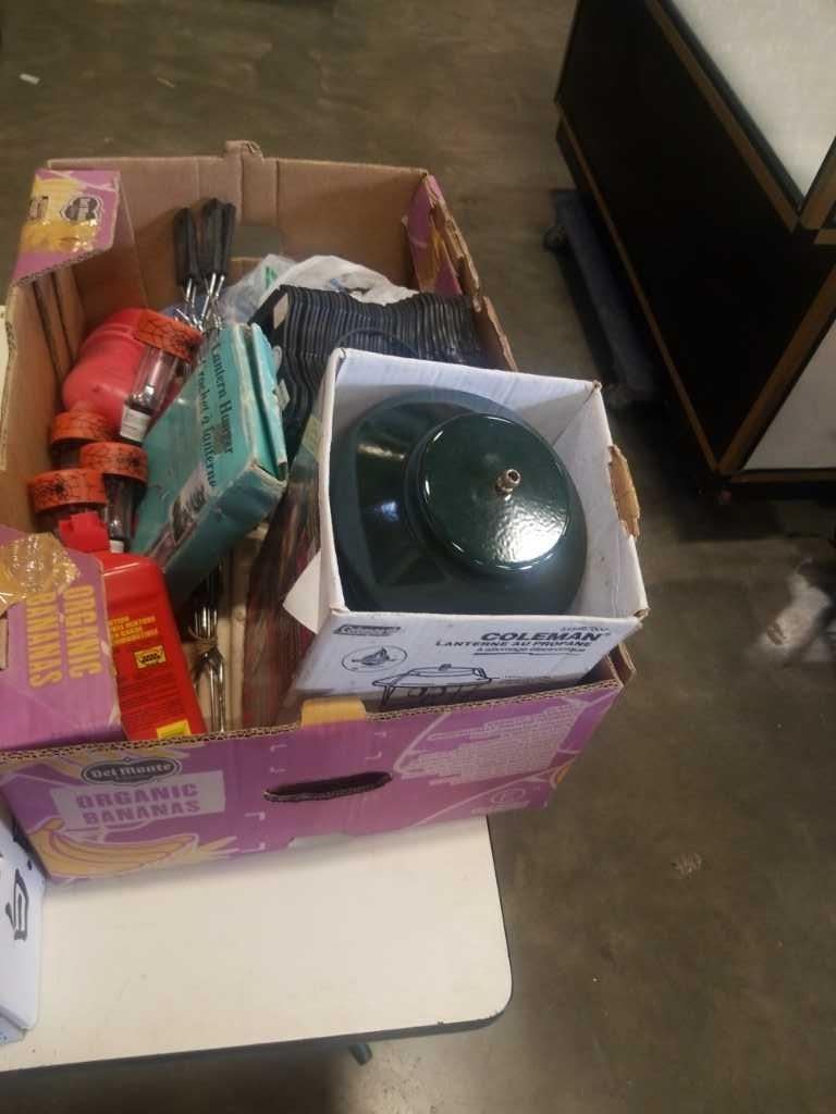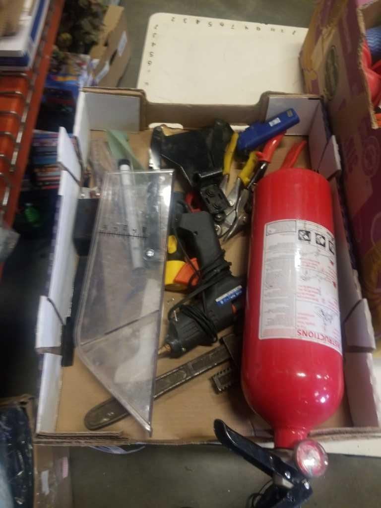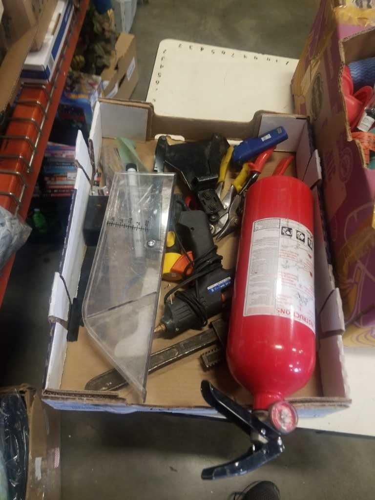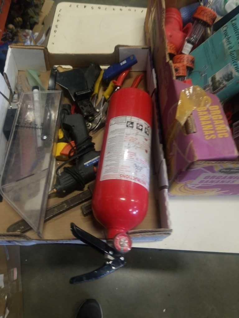 TRAY OF HOUSEHOLD ITEMS, COLEMAN LANTERN AND TRAY OF TOOLS, FIRE EXTINGUISHER, ETC