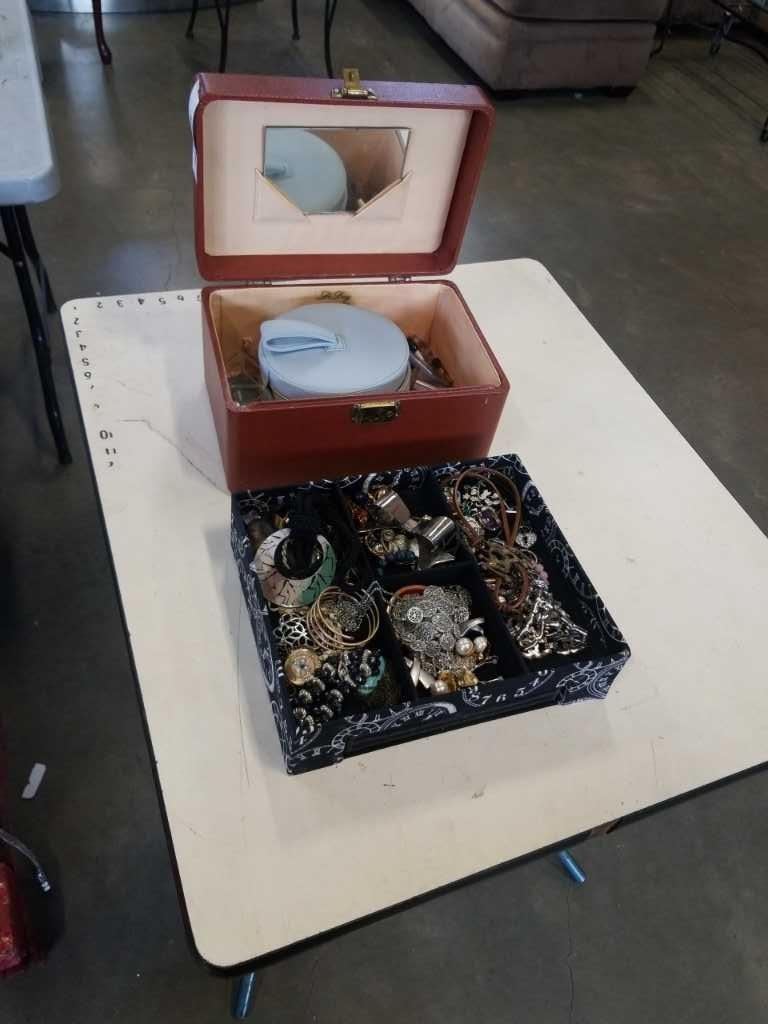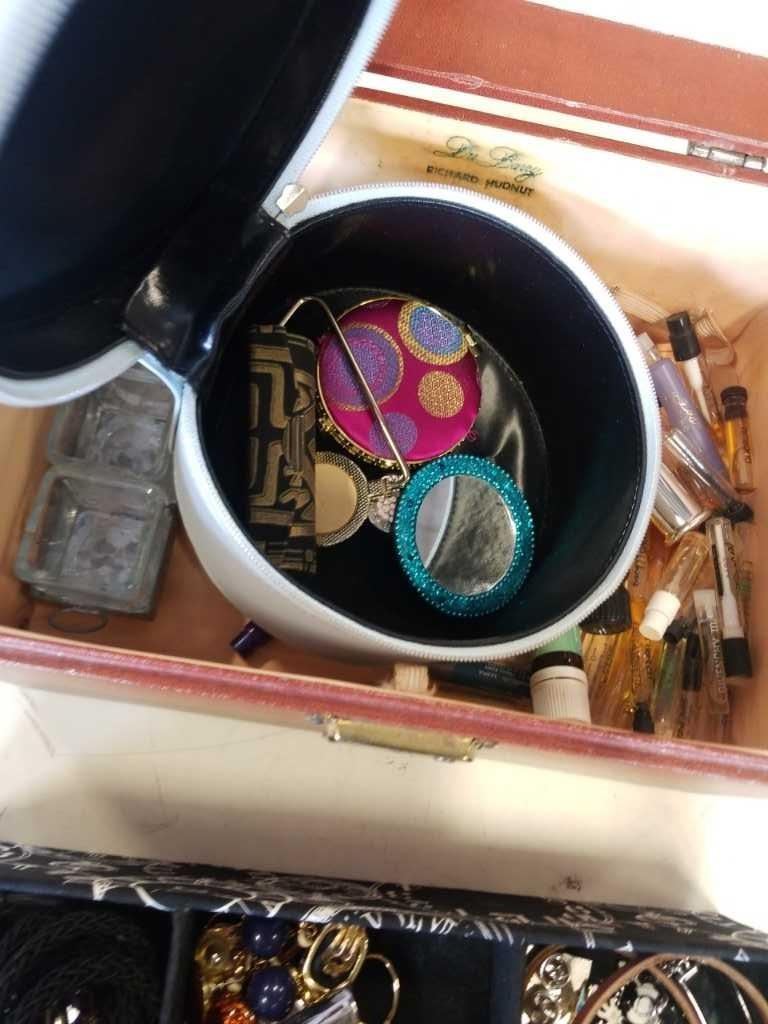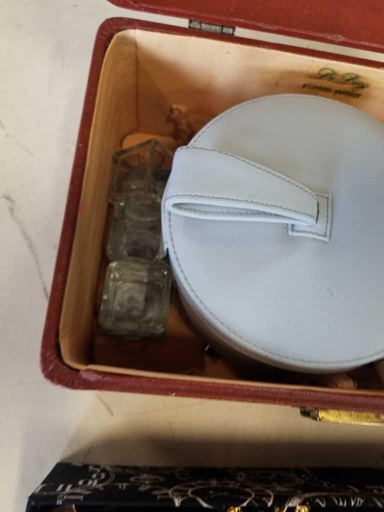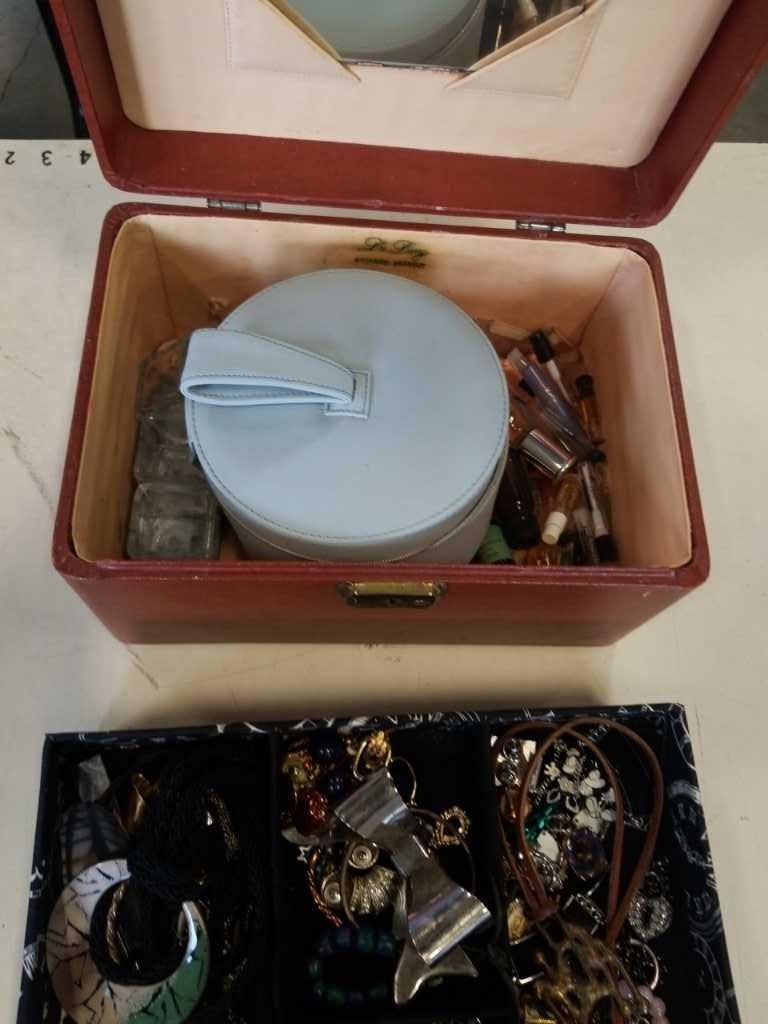 TRAY OF JEWELRY AND MAKEUP CASE WITH PERFUME