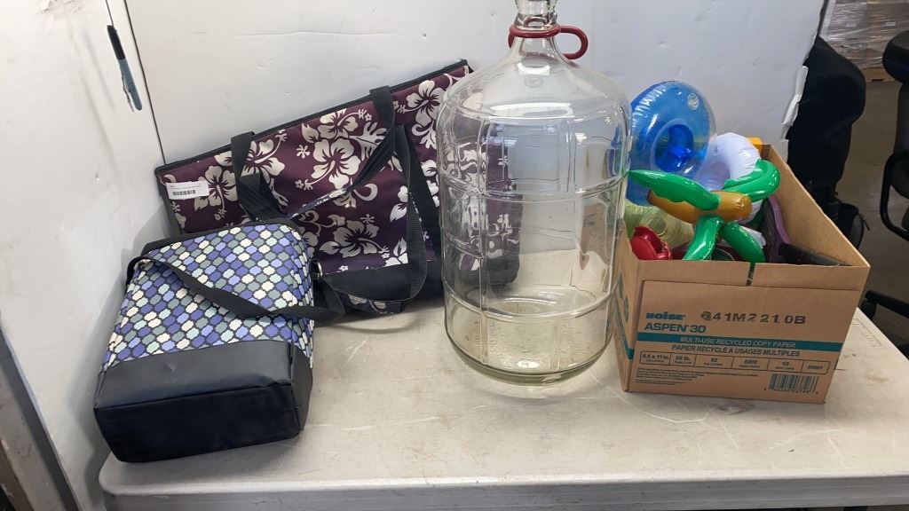 TRAY OF LANTERNS, 2 COOLER BAGS, MINI INFLATEABLES, GLASS CARBOYS