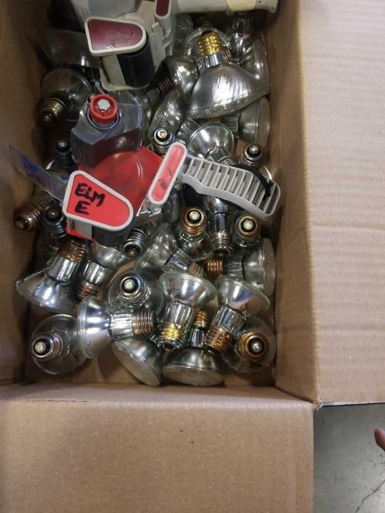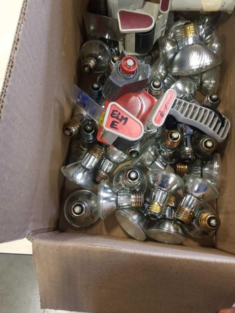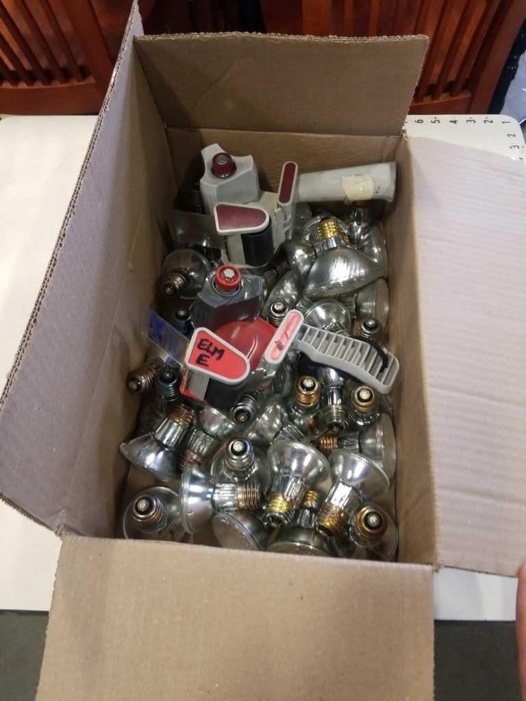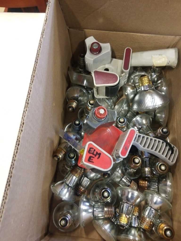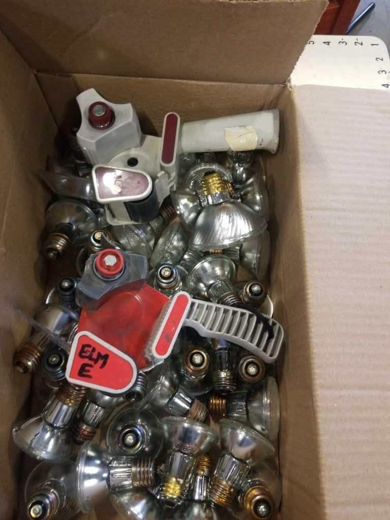 TRAY OF LIGHTBULBS AND TAPE DISPENSERS