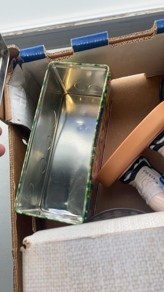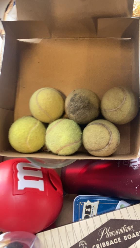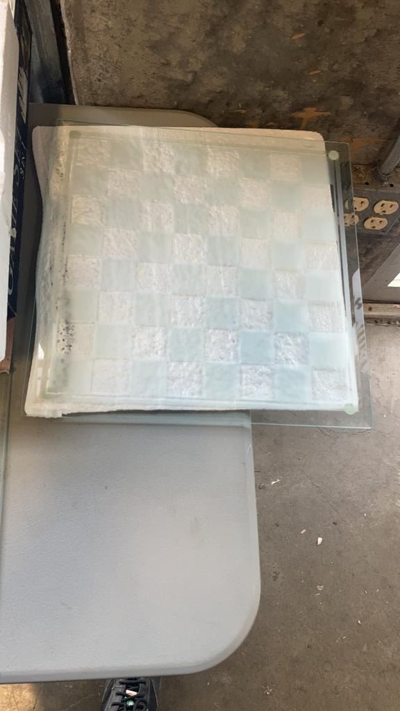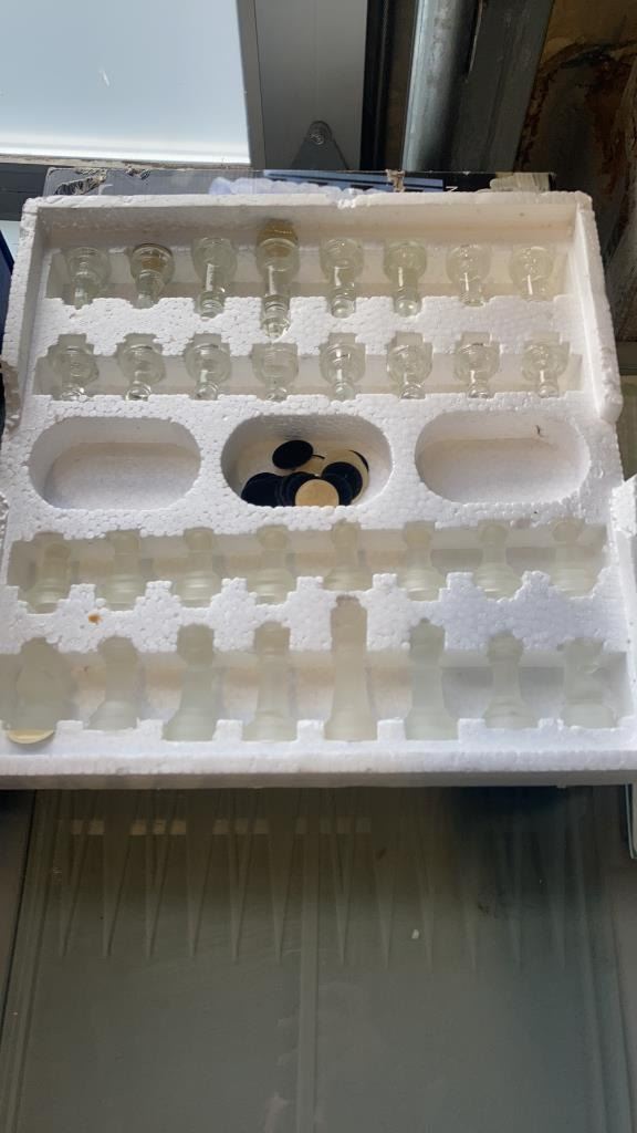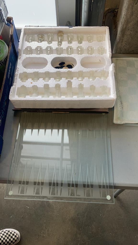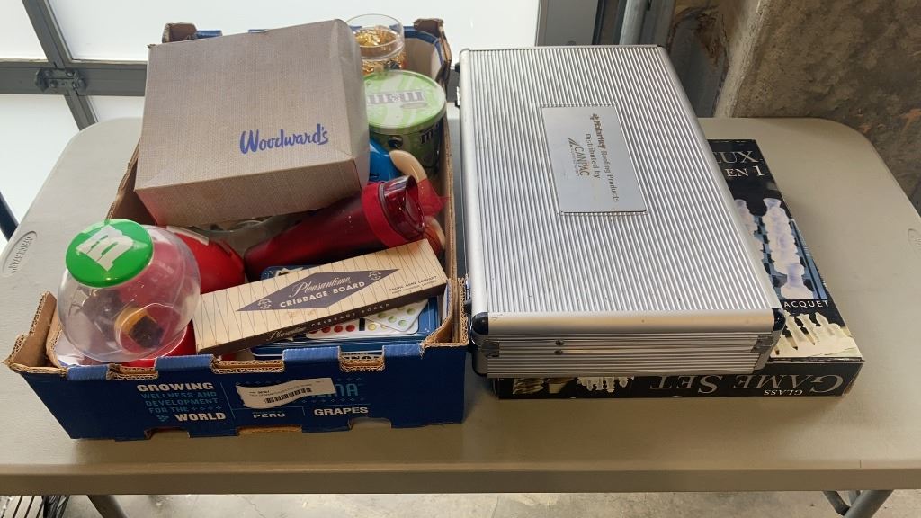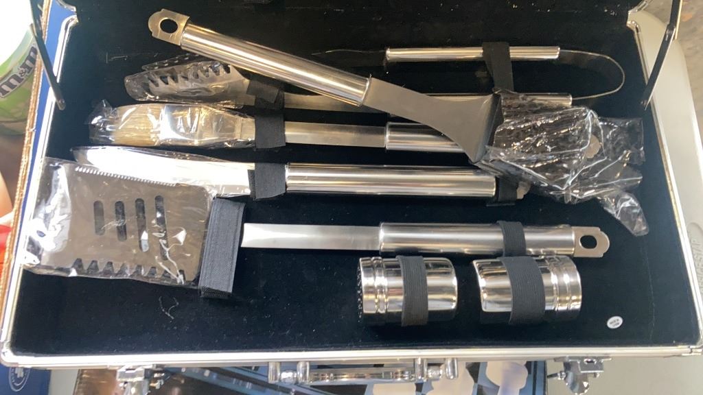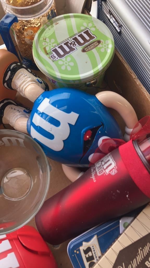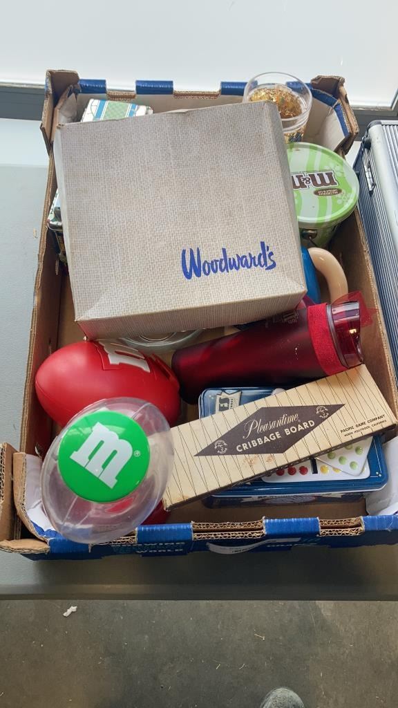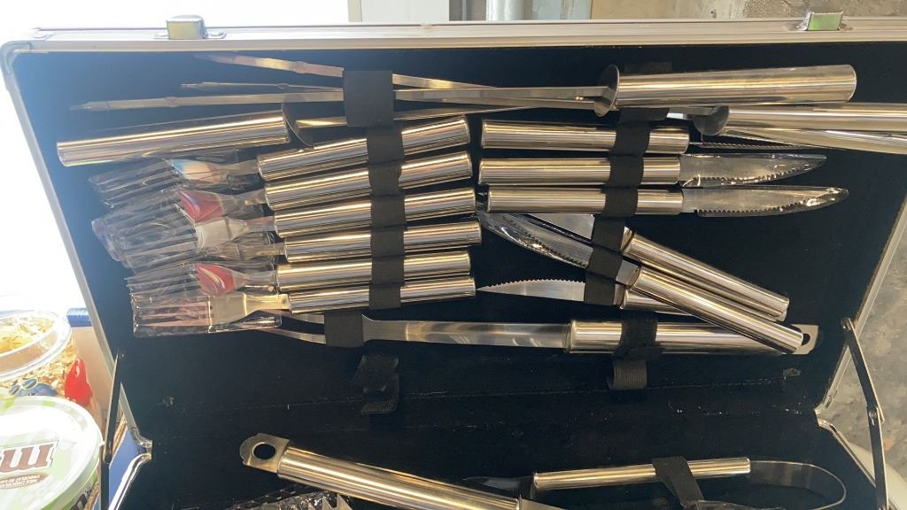 TRAY OF M&M COLLECTIBLES, GLASS CHESS SET, BBQ UTENSIL SET