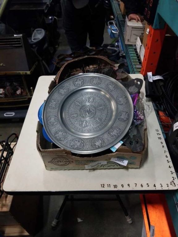 TRAY OF METAL DECOR, WIND CHIMES, GARDEN DECOR