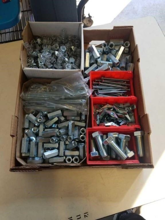 TRAY OF NEW HARDWARE FASTENERS BOLTS, NUTS AND SPRING NUTS